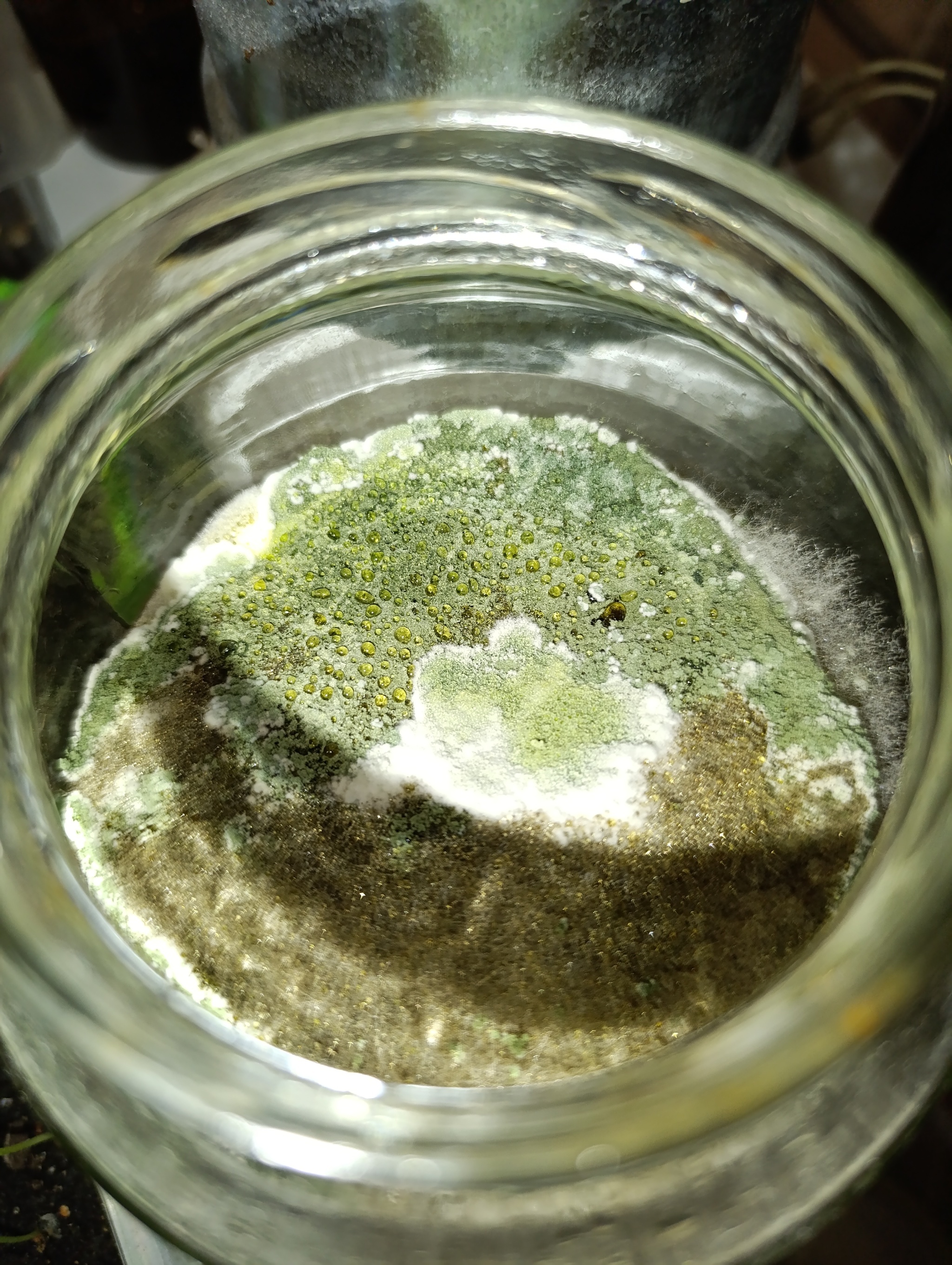 Сделал питательный раствор в прогретой в духовке банке и засыпал туда просроченную на пару лет триходерму. Дня 3-4 прошло, результата нет. Купил новую, засыпал ее. Через 2 дня начался бурный рост. Где-то через неделю "медуза" всплыла и запушистела. А ещё через неделю стало похоже, что выросло что-то не то. По виду больше похоже на плесень вида Мукор.
