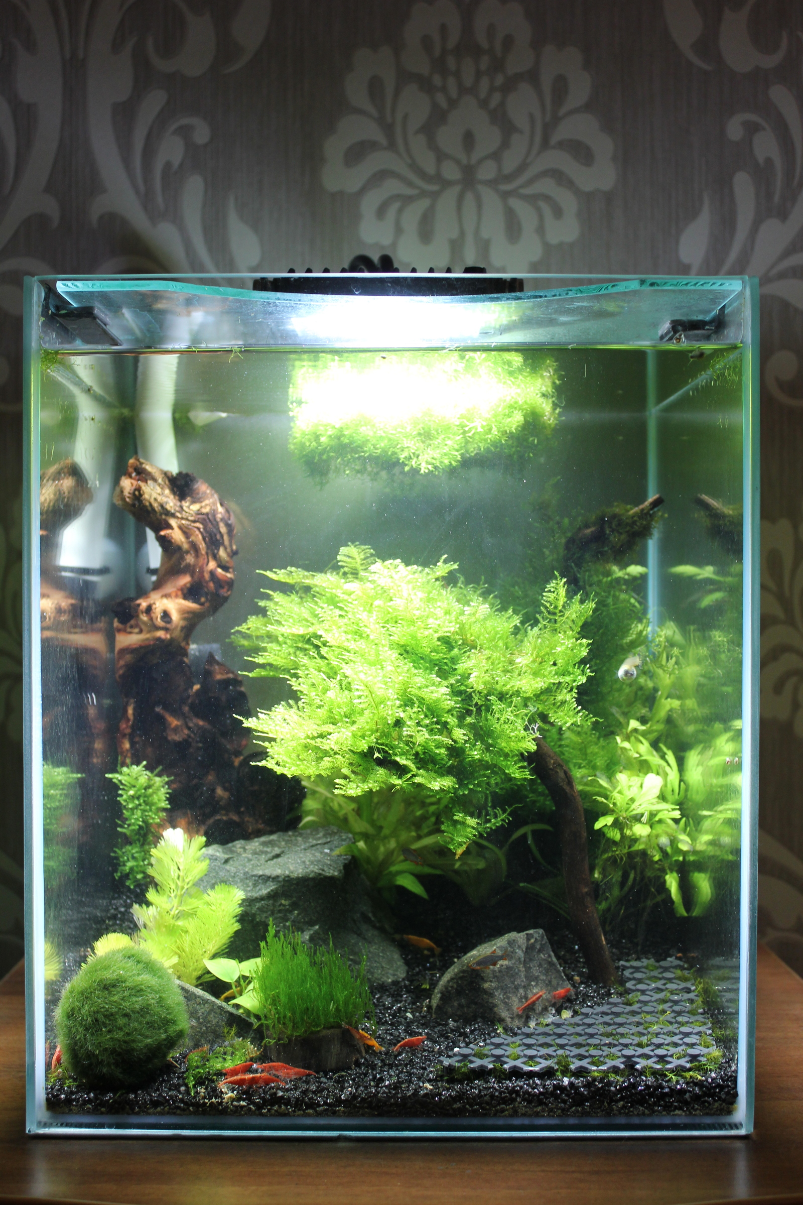 Итак, лежала банка из икеи. Какое-то время в ней был минитеррариум с растениями, надоело. Решил попробовать создать миниаквариум, просто, чтобы разбавить интерьер. засыпал грунт, кинул пару камней, к которым примотал мох кристмас. Кусочек лавы (может в ней бактерии разведутся, будет хорошо). Закинул компрессор, фильтра нет. Вода на 70% из действующего аквариума. Жильцы - штук 7-8 молоди вишневых креветок из моего другого аквариума. Свет - светодиодная лампа Gx53 Uniel 8W 4200K.