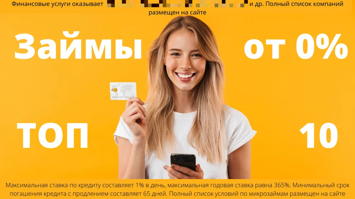 Я не такой человек чтобы я рекламировал ОПГ, поэтому я замазал все названия микрозаймов, а также слоганы, контакты и мелкий текст