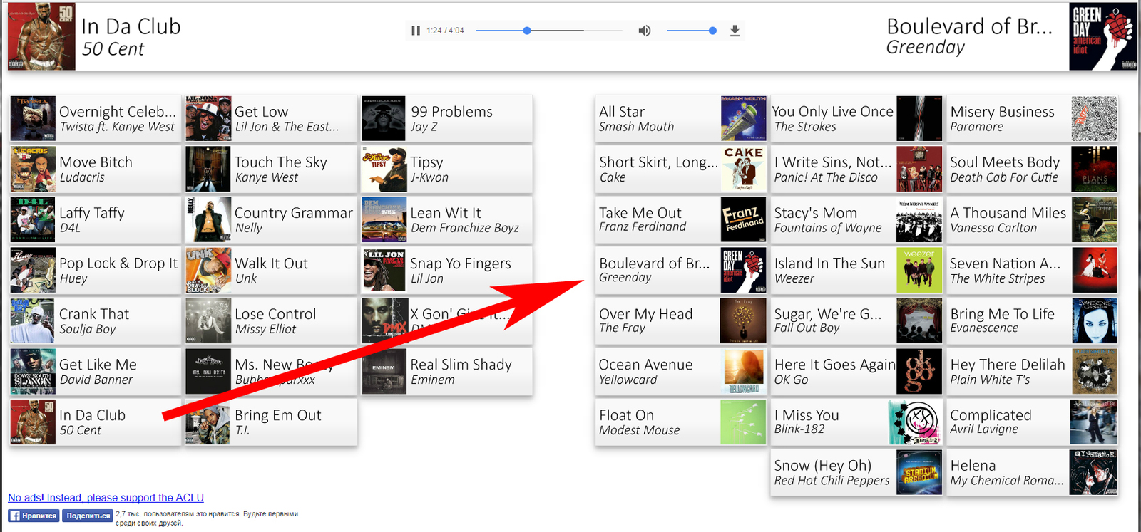Попался мне сайт позволяющий смешивать популярные рэп композиции с роковыми. Хочу поделиться. Получается необычно, но уверен что фанатом какого бы направления вы не были, новое звучание любимых композиций вас заинтересует. Чтобы всё заработало, достаточно выбрать и перетянуть композицию с левой стороны на композицию с правой. Надеюсь понравится, экспериментируйте!!)