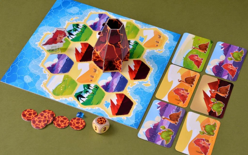 Игра детская и кооперативная, но четверо взрослых и заряженных на успех людей рубятся в неё, как в последний раз (мы проверяли). В общем, на тихом и уютном острове живут динозавры и занимаются своими динозаврскими делами. Вдруг вулкан в центре острова начинает извергаться! Динозаврам нужно устроить шесть встреч до того, как вулкан сделает шесть огненных плевков.