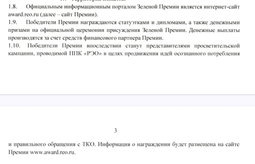 Пункт 1.10 гласит: "Победители Премии впоследствии станут представителями просветительской кампании, проводимой ППК "РЭО"... и далее по тексту.
