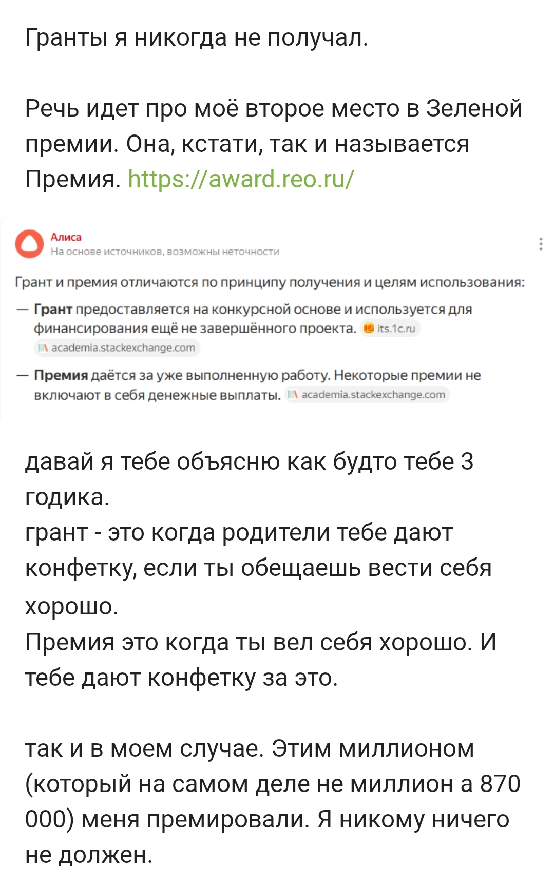 Чистомен сетует на предвзятость пикабу и утверждает, что никаких грантов не получал, никому ничего не должен. Так ли это?