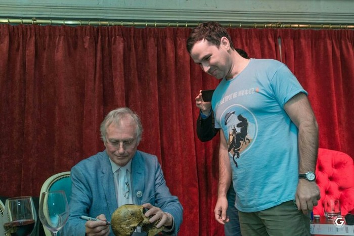 И после мероприятия по моей просьбе Ричард Докинз оставил на черепе автограф. Муляж с автографом скоро вернётся в экспозицию Биологического музея в Москве.