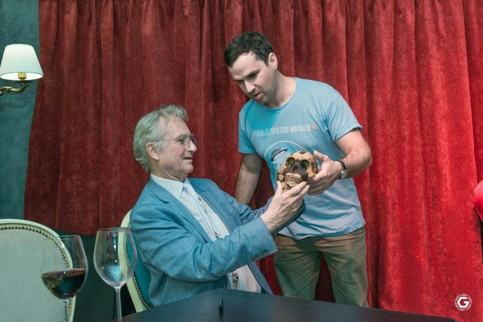 Как истинный учёный, Докинз предварил свой ответ предупреждением, что антропогенез не является областью его специализации, а затем отметил открытие Homo naledi в Южной Африке. По удивительному стечению обстоятельств, муляж черепа наледи в это время находился на нашем столе.