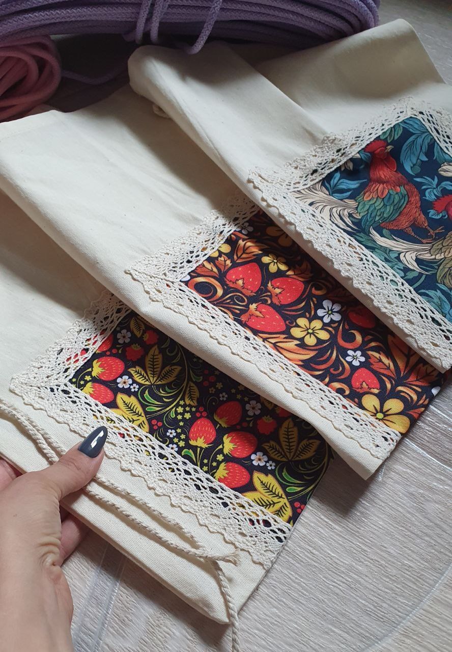 Клубника, малина, смородина, яблоки, груши, слива - всё плодоносит. Варенье мои домашние не очень, а вот сушеные ягоды и фрукты уплетают за милу душу. Думала самой нашить мешочков для сушеного урожая, но наткнулась в интернете на домашнятину - милоту... на вместительные мешочки! Какое чудо эти ягодки и петушки в обрамлении тесёмочки! Может и сама зимними вечерами набью руку на подобных мешочках, будем наши изделия в такие мешочки упаковывать!