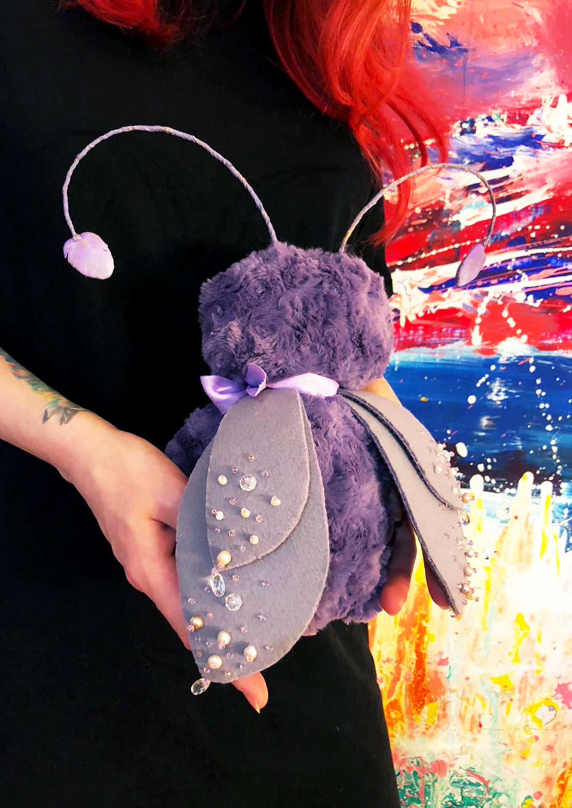 Для создания Сиреневой моли были использованы: полимерная глина, полиуретан, акриловые краски, сусальное золото, натуральный жемчуг, фетр, нежнейший искусственный плюш.