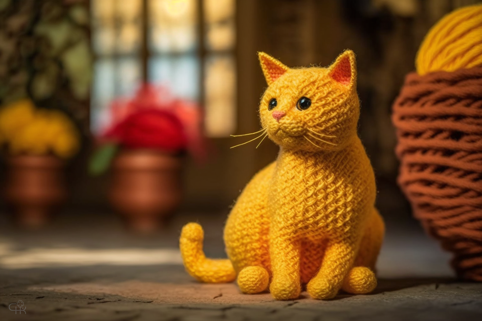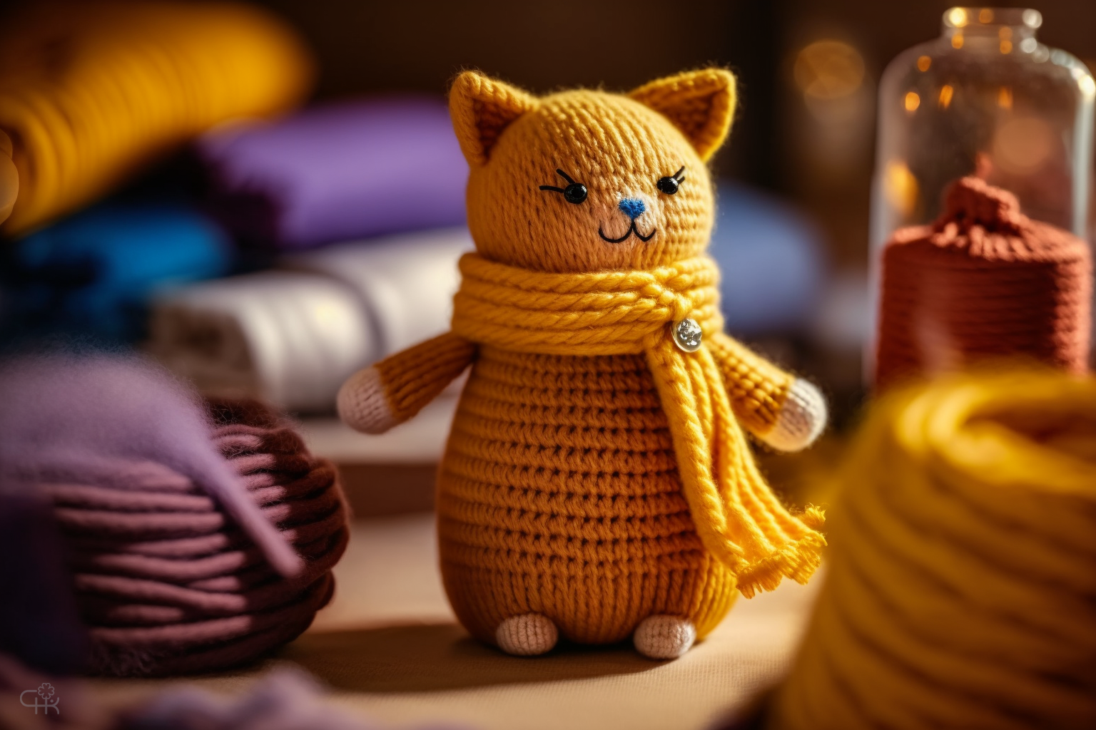 Промпт: a very beautiful amigurumi cute cat knitted from wool, handmade, beautiful yellow-red color, fine details, decoration and ornamentation, detailed elaboration, masterpiece, design concept, light blurred background, bright contrast studio lighting, high-quality photography, 8k, hd, advertising photography, backlighting, decoration on the background.