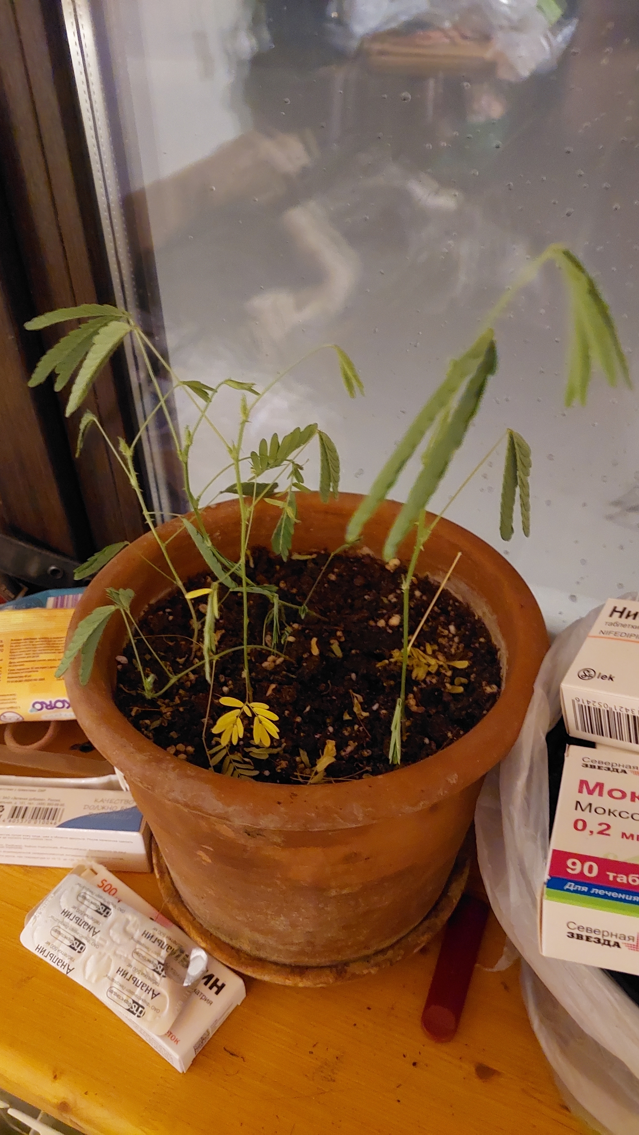 Из семян вылезло 5 штук. Что-то нижние листики желтеют и опадают. Надо ли её пересаживать каждую отдельно? Трогать вообще страшно, чуть что - падает и закрывается. Даже на опрыскивания такая реакция.