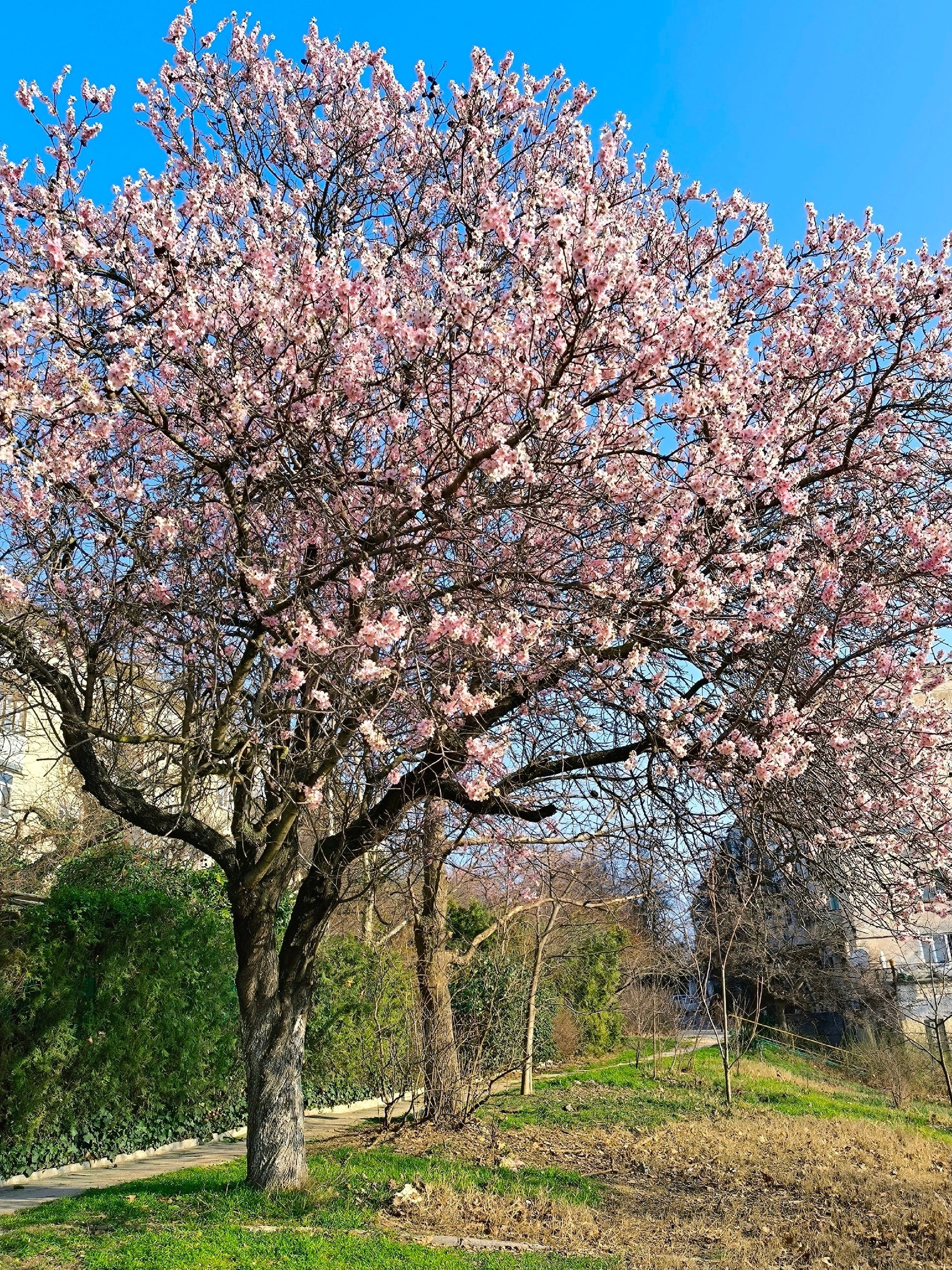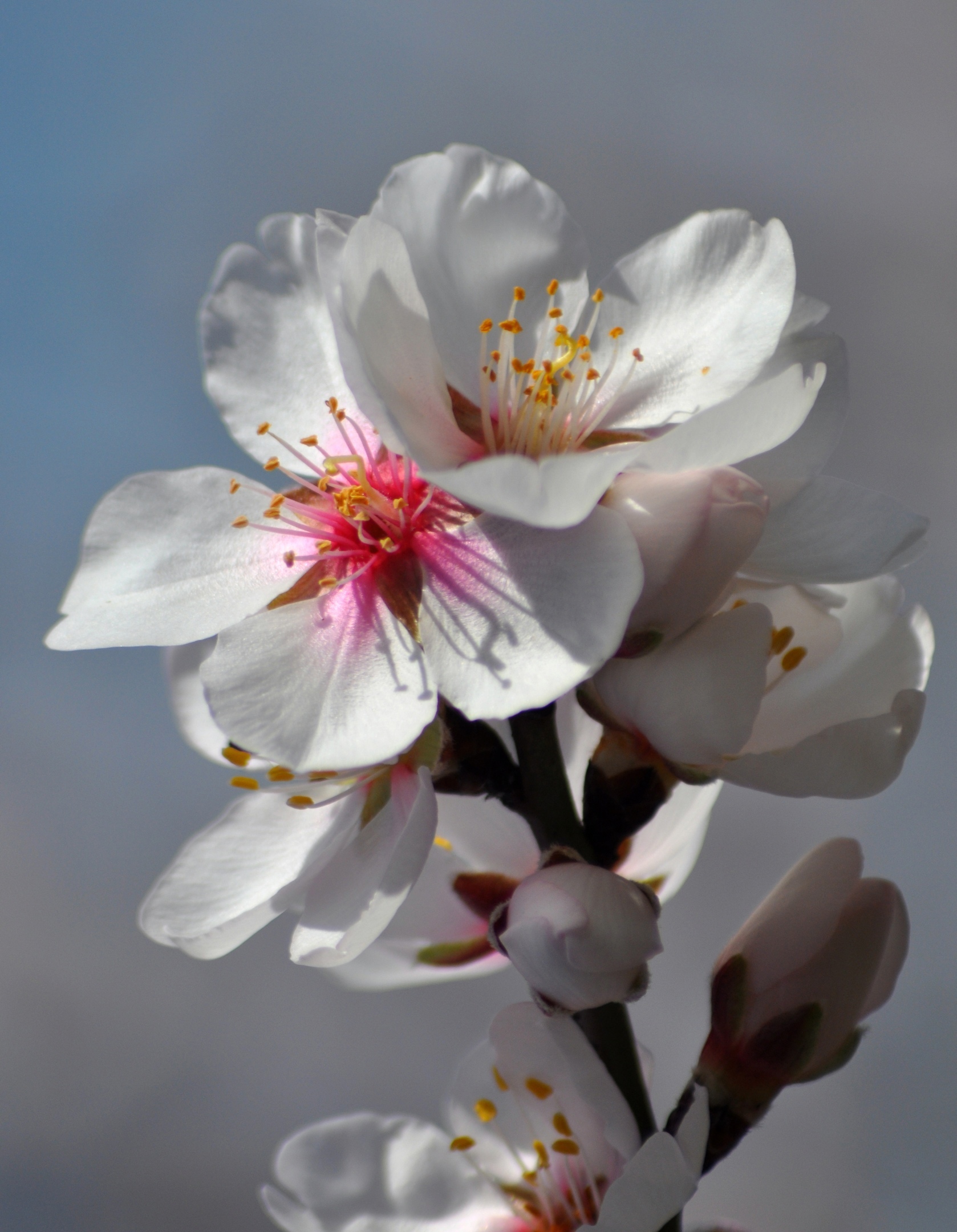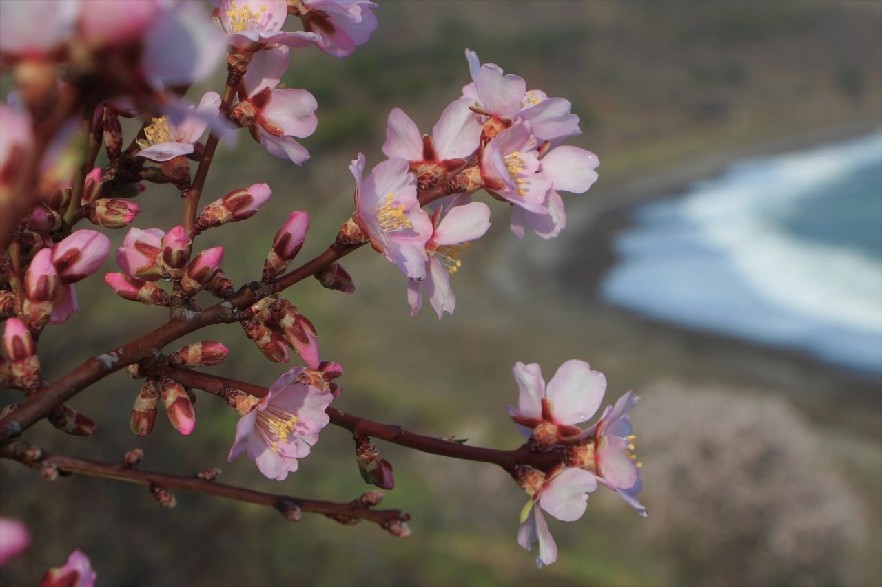 Миндаль (Prunus dulcis, ранее Amygdalus communis) является одним из самых раннецветущих деревьев в нашей стране. Уже в феврале в Крыму появляются первые цветы, а в марте-апреле можно наблюдать массовые цветения миндальных садов. Лепестки миндаля розовые, кремовые или почти белые. В центре находятся желтые тычинки.
