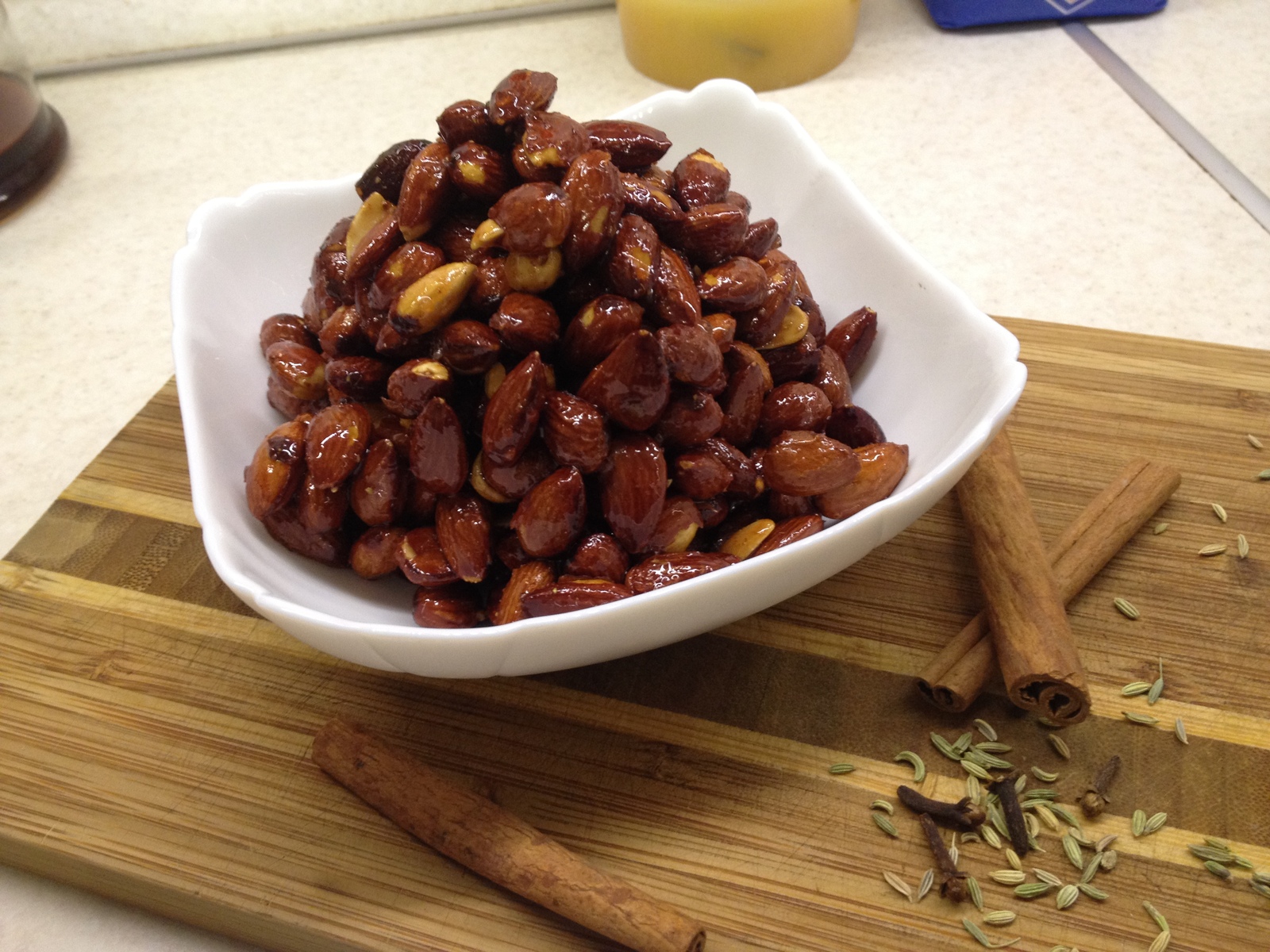 Запечёный в духовке миндаль в пряной карамельной глазури можно отнести и к закуске и в то же время это может быть частью десерта.