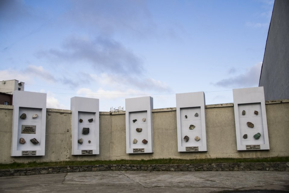 На стене рядом с Ледовым дворцом можно увидеть 24 образца минералов, среди которых аметист, кварц, амазонит, гранит и другие.