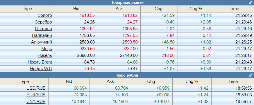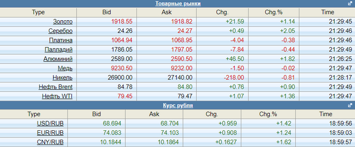 Товарная и валютная биржа. Сегодня растёт всё, кроме рубля. Золото, серебро, нефть Brent... Рубль снизился на 1,4%, правда, это не приблизило его даже к середине зимнего коридора 67-73. Позавчерашняя котировка Urals - 53.04. Растёт на 3%. Газ ТТФ опять сходил ниже 700. Сейчас - 703. Довольно низкая цена, по сравнению с недавними пиками. Но всё равно, почти в три раза выше "нормальной". Биктойн взялся расти - сейчас он 19303 доллара. Для меня причины его роста непонятны. Впрочем, это личное.