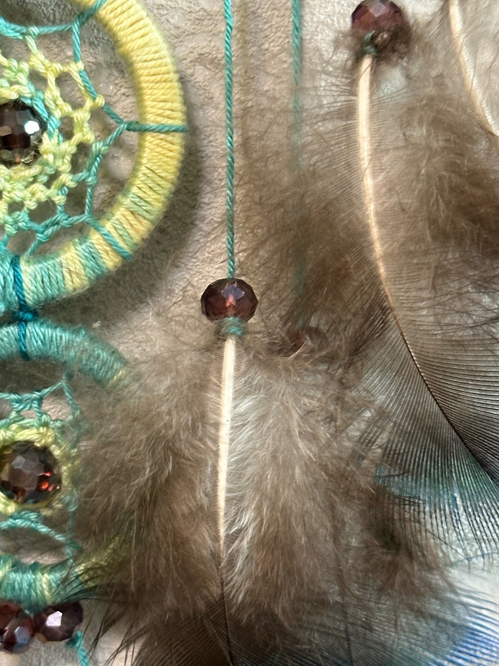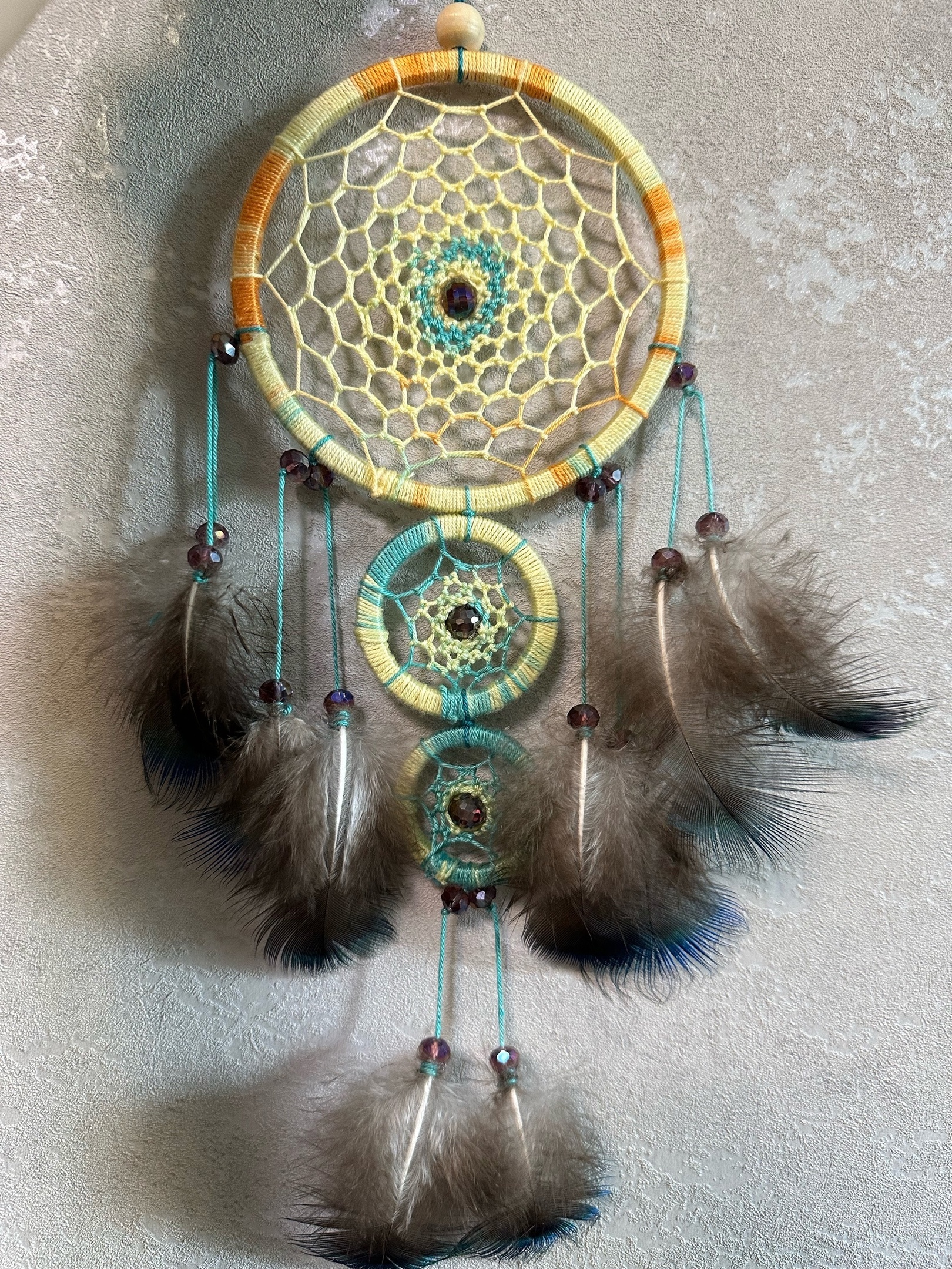 Использовала акриловую, пеструю пряжу; стеклянные бусины; перья павлина; крепкие основы из дерева.
