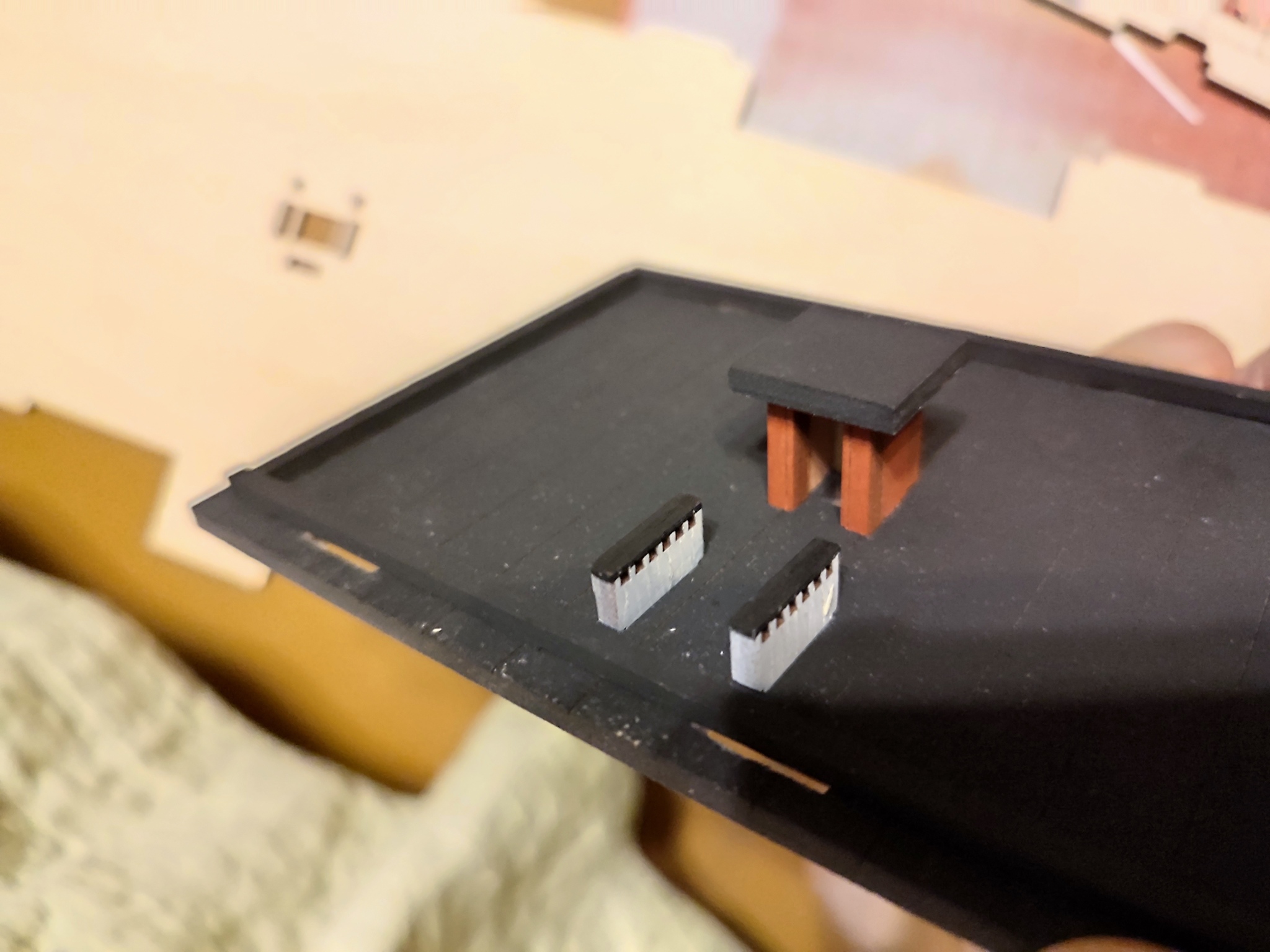 Как высохнет корпус, снимаю крышу, мажу клеем крышу, вставляю и сразу ставлю ограждение. Оно же маскирует торчащие пазы от корпуса. Потом под резинки, и сохнуть.