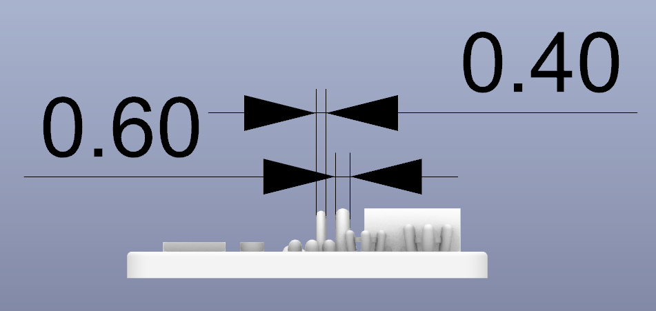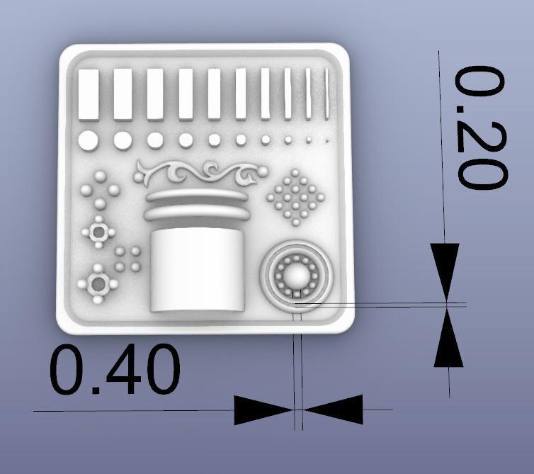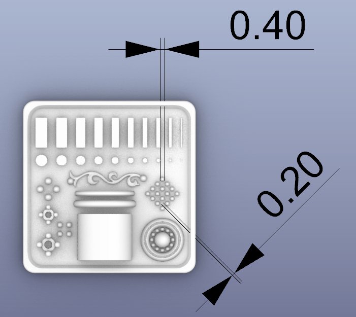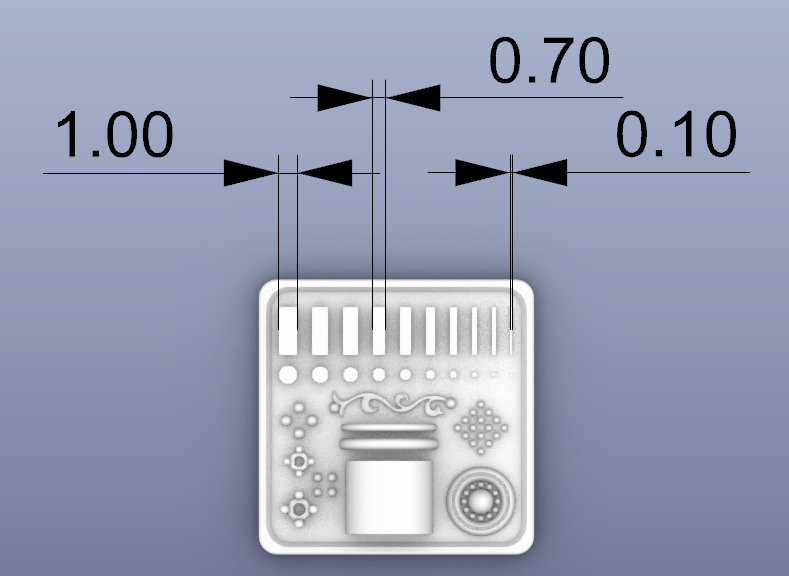 Обратите внимание: самые крайние элементы 0.1мм почти всегда отсутствуют. Такой размер — это почти предел для данной технологии. Получаются они при условии, что фотополимер очень точный а принтер высокого класса . Основная масса недорогих решений этим качеством не обладают.
