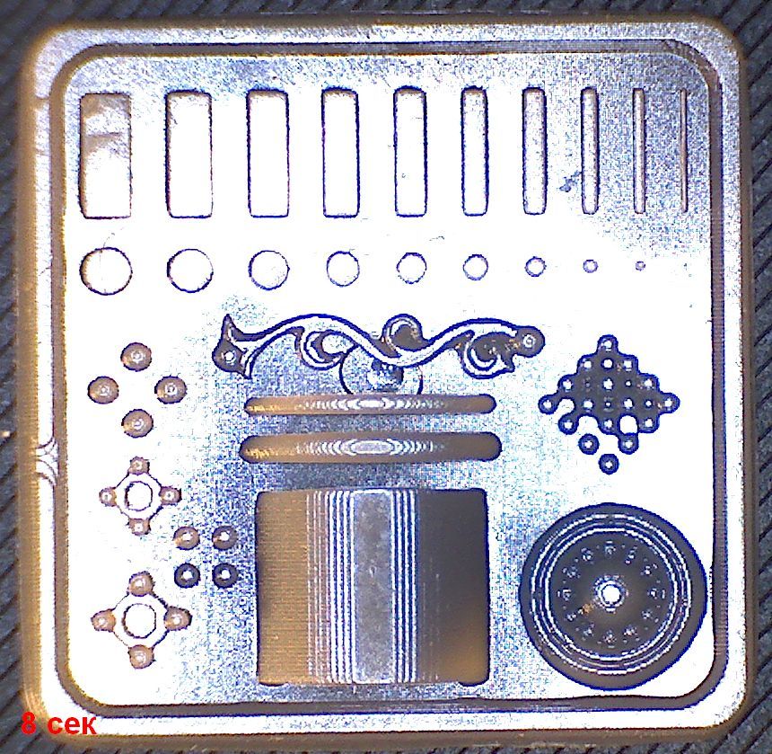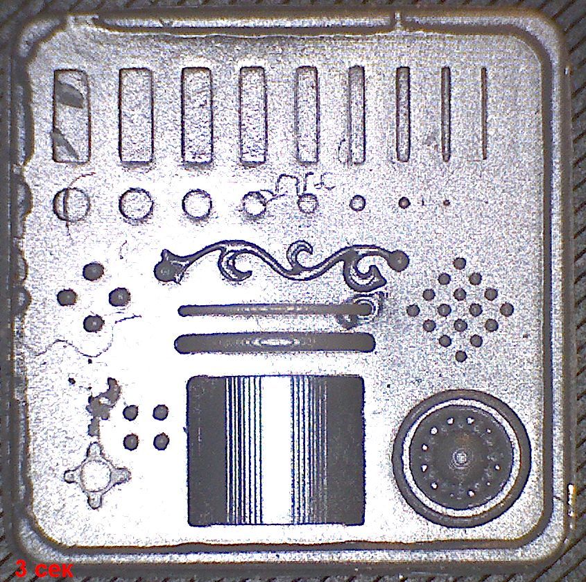 Теперь - реальные фото тестовых пластин. Печать проводилась 4 раза. Время экспозиции 3,5,8 и 12 секунд. По фото, основываясь на прочитанном, сами сделайте выводы.