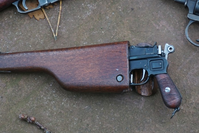 Маузер выполнен полностью из стали. Стреляет патронами калибра 3.5мм, чуть слабее кольта из прошлого поста. На модельке есть рабочий предохранитель и затворная задержка.