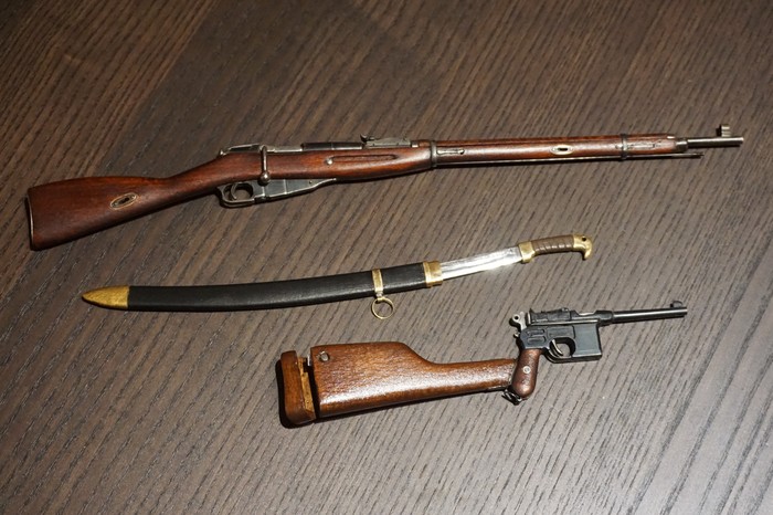 Угловатый силуэт с длинным стволом и тонкой рукояткой, кобура-приклад из дерева на тонком кожаном ремешке, ни один советский фильм про революцию или гражданскую войну не обходился без этого колоритного "товарища". На вскидку: "Белое солнце пустыни", "Офицеры", "Приключения неуловимых", "Свадьба в Малиновке" и куча других. А теперь Маузер есть и в моей коллекции миниатюрок, в масштабе 1:3.5
