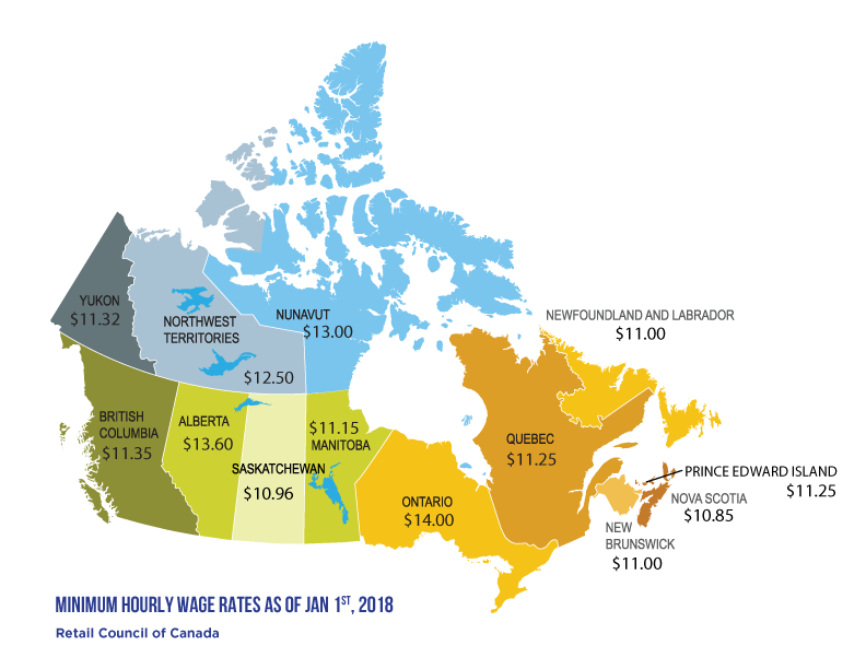 В соответствии с Конституцией Канады, ответственность за соблюдение трудового законодательства на национальном уровне, включая установление минимальных ставок оплаты труда, возложена на власти десяти провинций и трех территорий страны. То есть ежегодно, исходя из показателей инфляции, безработицы и других экономических факторов, чиновники каждой административной единицы пересматривают действующие нормы минимальных зарплат.