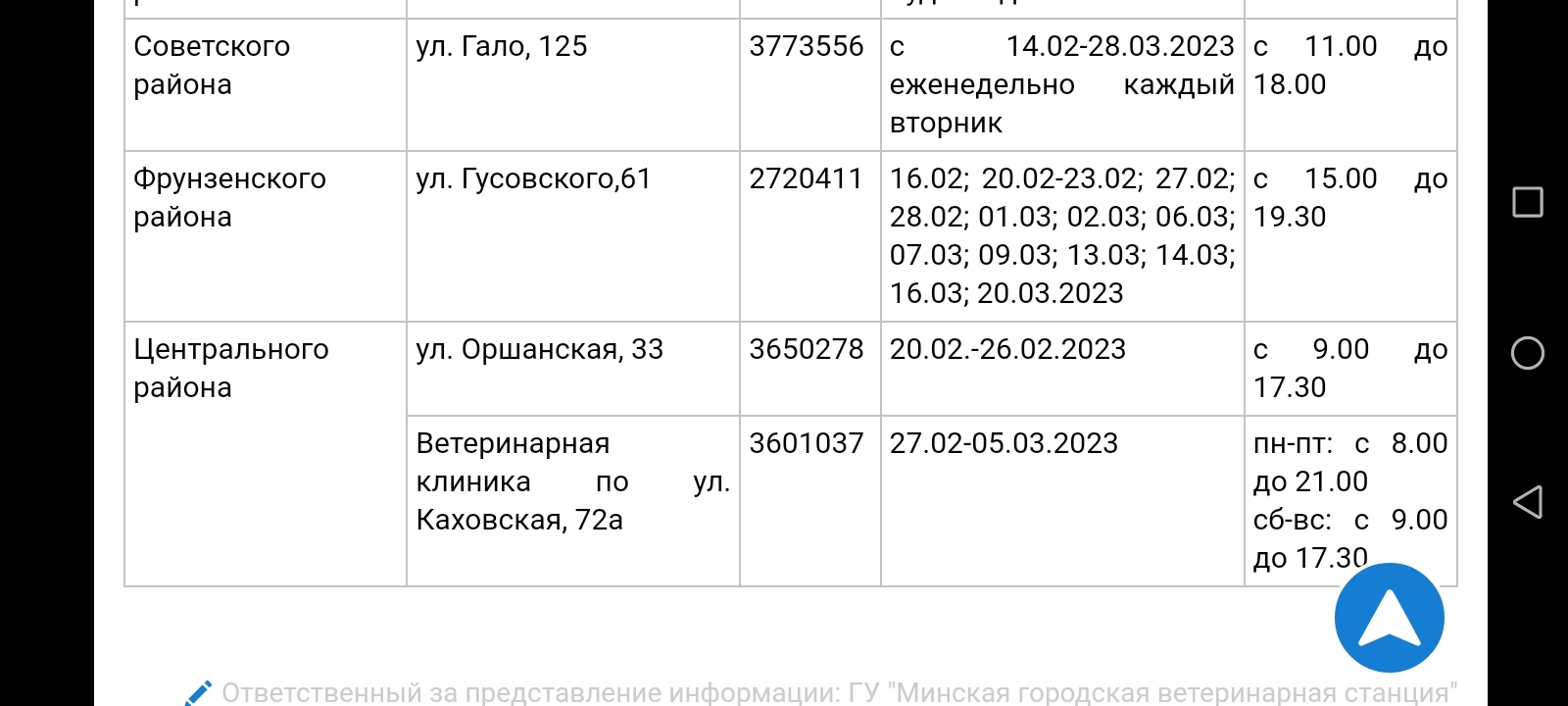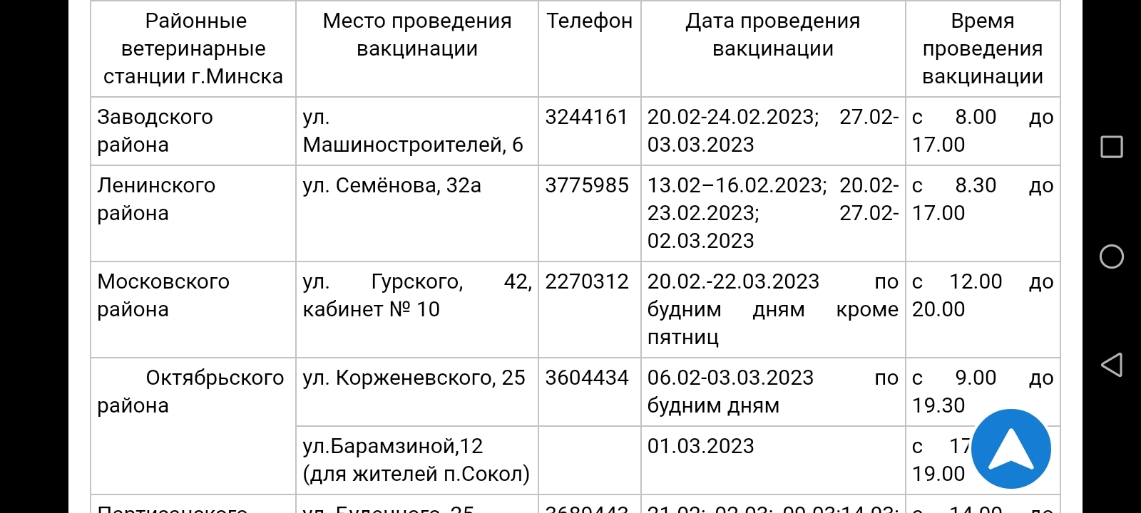 "Внимание жителей г. Минска, в феврале-марте месяце 2023 года будет проводиться бесплатная вакцинация собак и кошек против бешенства с использованием бесплатной антирабической вакцины «Белраб» (пр-во ОАО «БелВитунифарм» РБ), а также осмотр на микроспорию. Вакцинация будет проходить по месту размещения районных ветеринарных станций города, согласно утвержденных ЖКХ графиков, а для владельцев животных, проживающих в микрорайоне «Сокол» Октябрьского района, по месту их проживания в специально отведенном помещении, предварительно согласованном с территориальным центром гигиены и эпидемиологии.