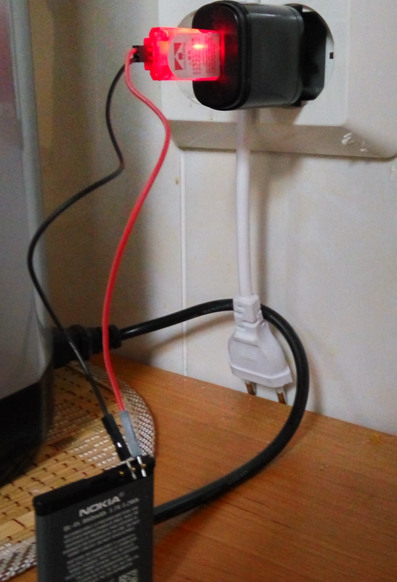 WARNING! не повторяйте это у себя дома, может бабахнуть! Берем зарядку от китайского квадрокоптера: на выходе у нее 300мА и никаких контроллеров, самое то, чтобы нежно подтолкнуть батарею напрямую, при помощи пары проводов dupont цепляется эта машина смерти к обычному блоку на 1А от какого-то смартфона: