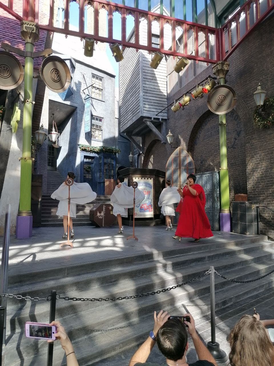 В этом же парке было два "шоу". Первое шоу - нам рассказывали сказку Барда Бидля про трёх братьев. Второе шоу - вот эта замечательная женщина пела нам зажигательные рождественские песни. Так, вроде всё посмотрели, пора двигаться в следующий парк. Ах да, сначала отстоим минут 40 в очереди на поезд)