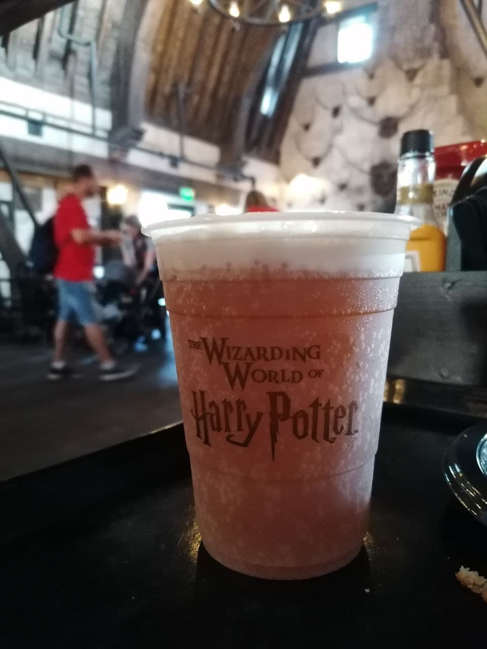 В Хогсмиде можно зайти в кафе "Три метлы" и попробовать сливочное пиво. Butterbeer. Его подают в трёх разных вариантах: тёплое, холодное, со льдом. Не берите тёплое! Я брала холодное. Мне ооочень понравилось. Очень нежный и приятный вкус. Оно с пузырьками, мне немного напоминает наш буратино, но менее сладкий. 8 долларов за такой стаканчик.
