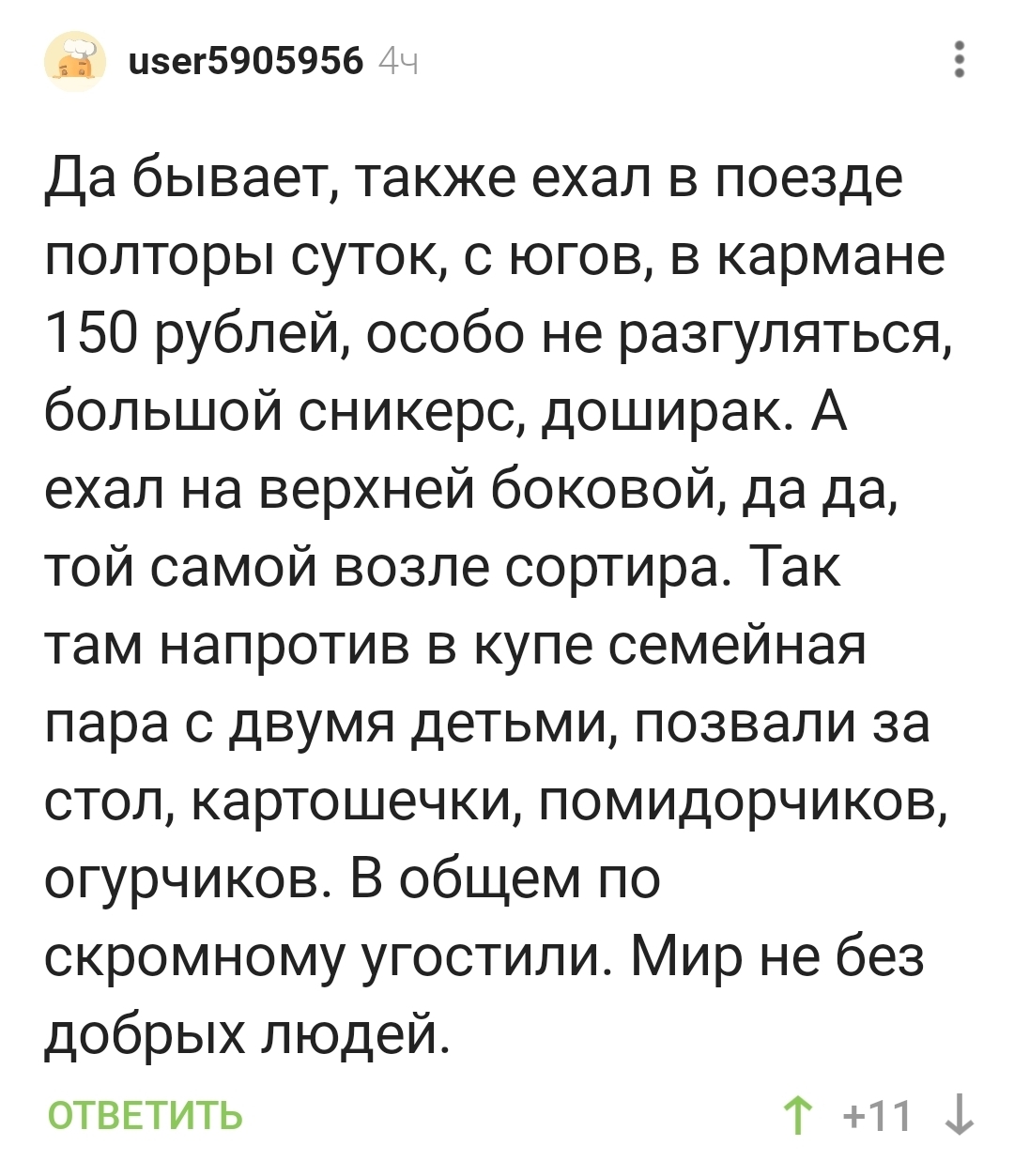 4 Wellikan Кулинария Мир не без добрых людей 7 часов назад #comment_381889168 Поезд Еда Доброта Комментарии на Пикабу 1 1 Ещё 0