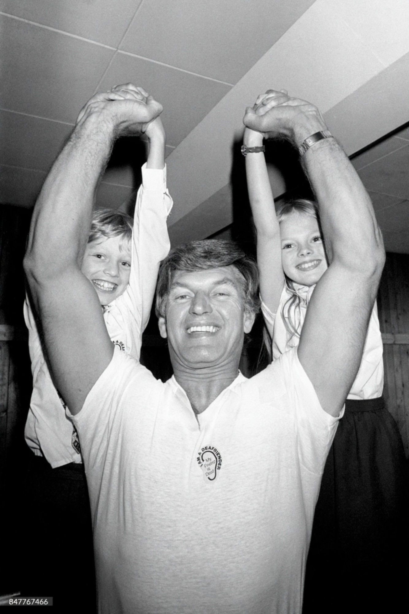 Актёр Дэвид Проуз, он же Дарт Вейдер из Звёздных войн, поднимает двух глухих десятилетних детей, из начальной школы Кингсли в Кройдоне. Лондон, 10 февраля 1980 года.