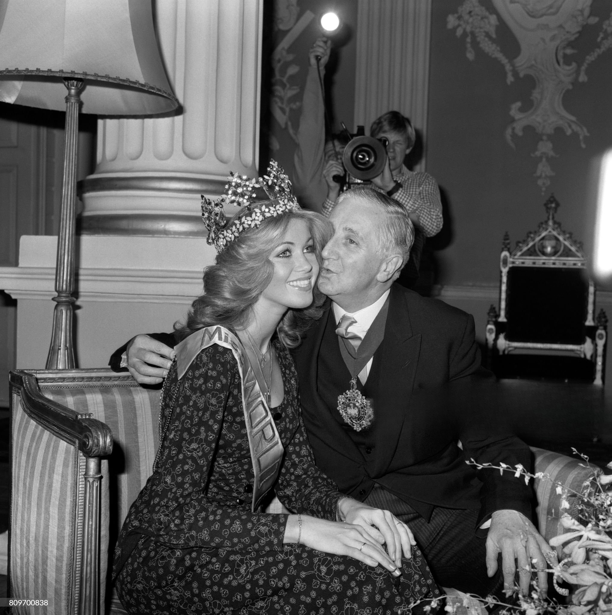 Мисс мира 1980 года Габриэлла Брум (Мисс Германия), наслаждается завтраком с шампанским в "Мэншн-Хаусе", с лорд-мэром Лондона сэром Рональдом Гарднером-Торпом. 14 ноября 1980 года.