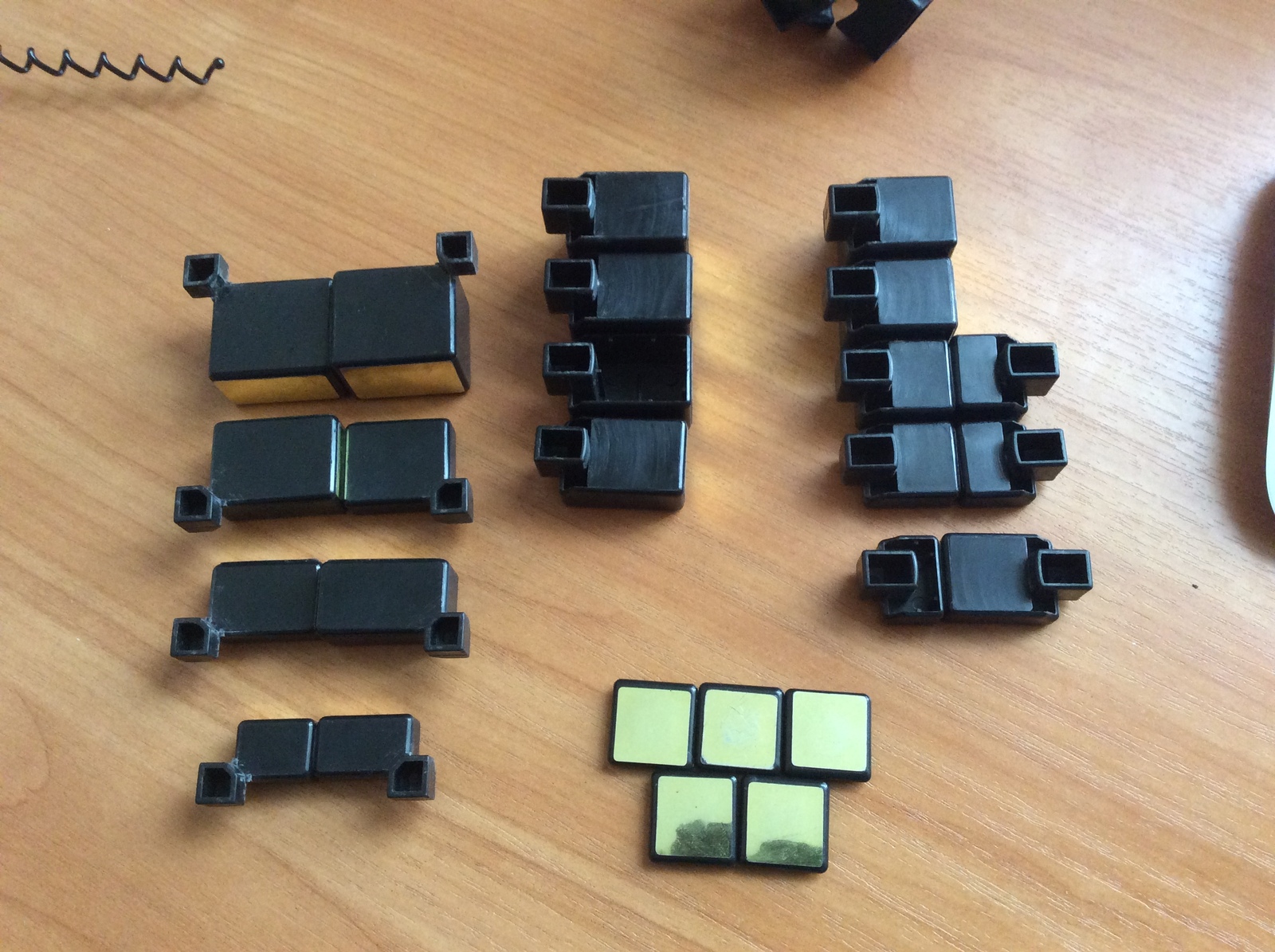 Внутри он похож на Рубикс, но с утолщенной крестовиной, чтобы не ломалась. Крышки у крестовины, как и элементы снять можно, пружинка есть, но, к сожалению, сильно развинчивать центры нельзя - будет постоянно ломаться. Ах, да, на картинке только пять крышек центров, я не смог отломать шестую, она очень маленькая.