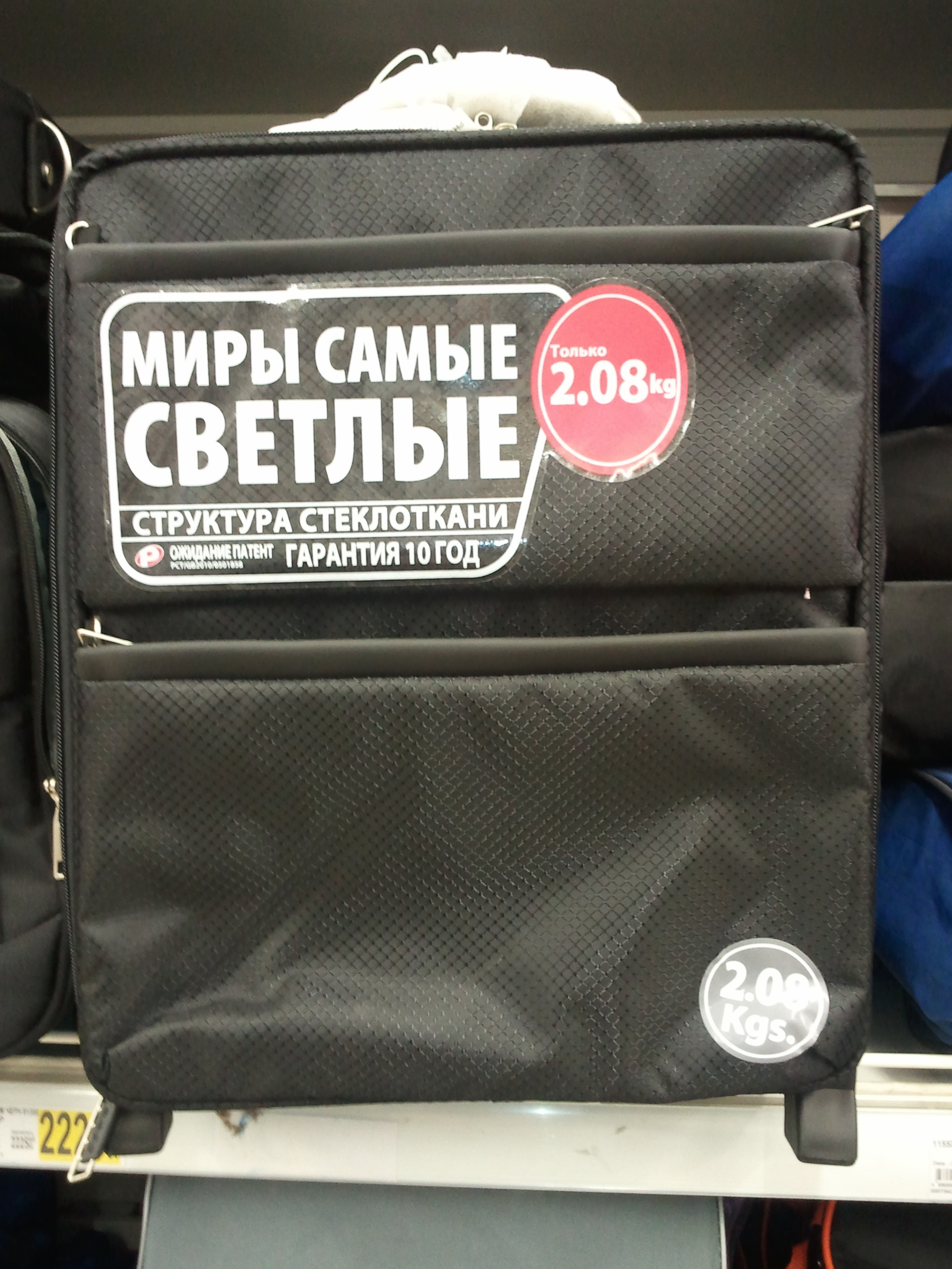 Именно так переведена фраза "The World's Lightest" ("Самый лёгкий в мире"), судя по тому, что аж в двух местах указан вес чемодана "только 2,08 kg". Ну и "Гарантия 10 год" и "Ожидание патент" в виде бонуса 😜
