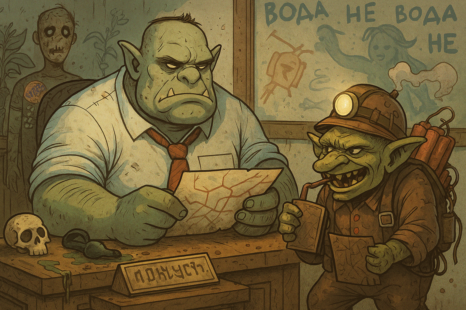 Топот за дверью перешёл в скрежет — будто кто-то тащил вагонетку по рельсам под саундтрек из «Безумного Макса». Дверь скрипнула, и в кабинет вполз гоблин по имени Шахтёр. Не просто гоблин — архетипичный: шахтёрский шлем с мигающей лампочкой, как аварийный маячок на болиде Renault в 2008-м; комбинезон, усыпанный угольной пылью; ранец, из которого торчали фитили динамита. В лапах — карта подземелий, разворачивающаяся как план атаки на Монцу, и взгляд, полный той самой гоблинской хитрости, что в переводе означала: «Я взорву твою бюрократию, как Кобаяши — двигатель в Honda».