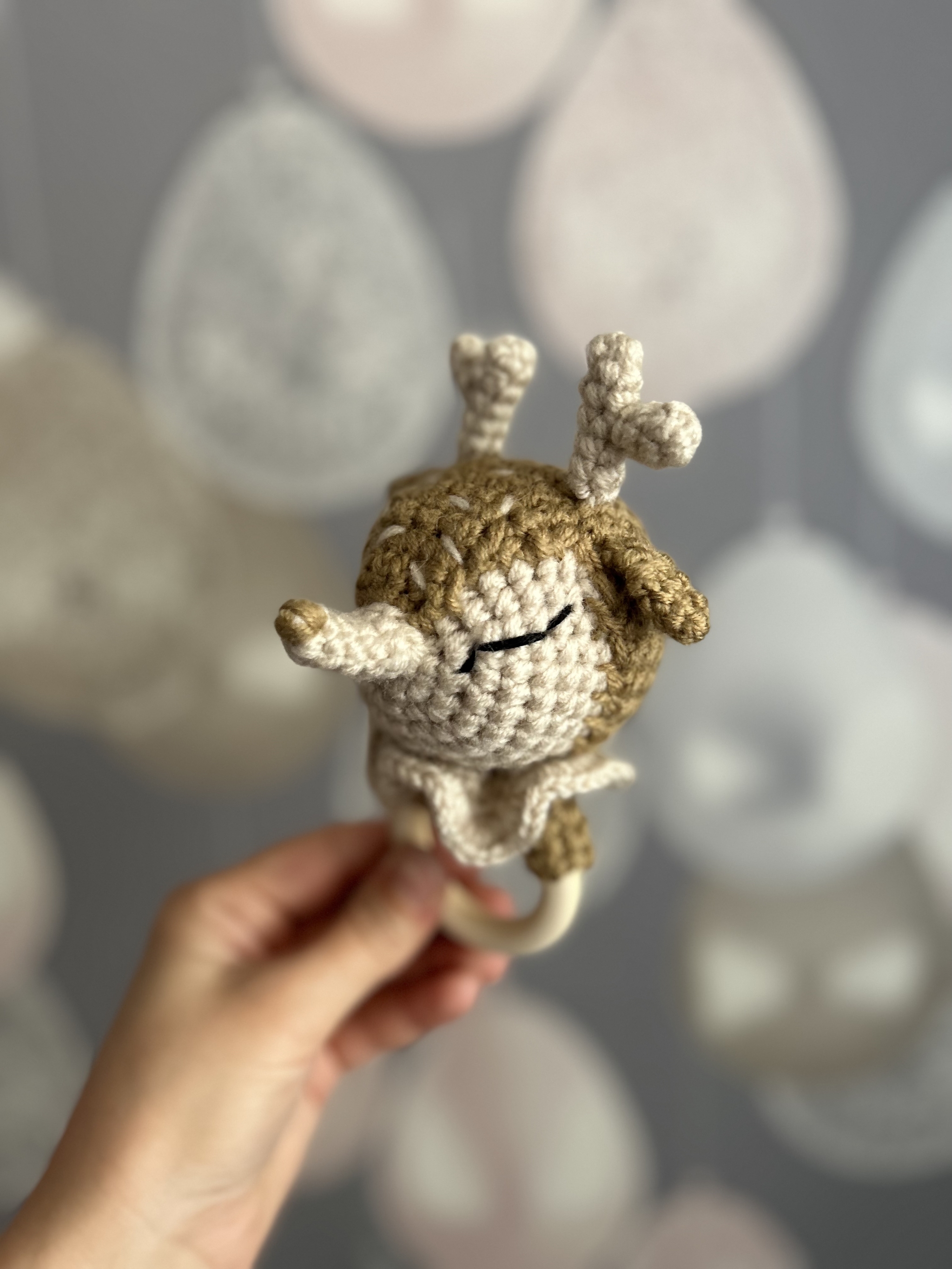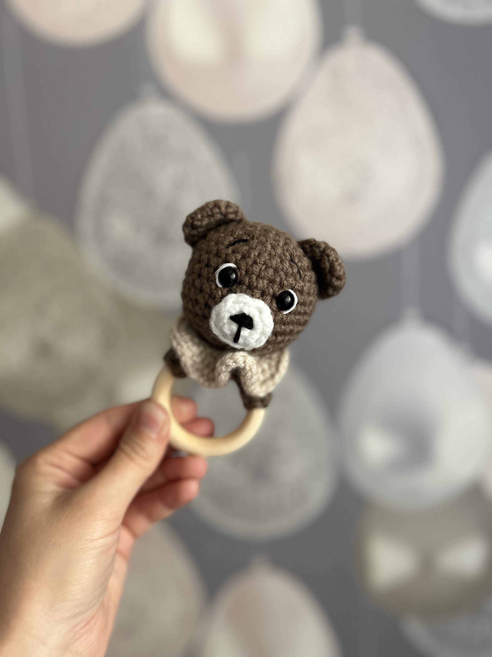Вязала пряжей«Детская Пехорка», крючком номер 3. Внутри холлофайбер и шарик-гремелка. Глазки у мишки на безопасном креплении, мордочку оленёнку вышивала иглой для вязания. Погремушки на буковом колечке.