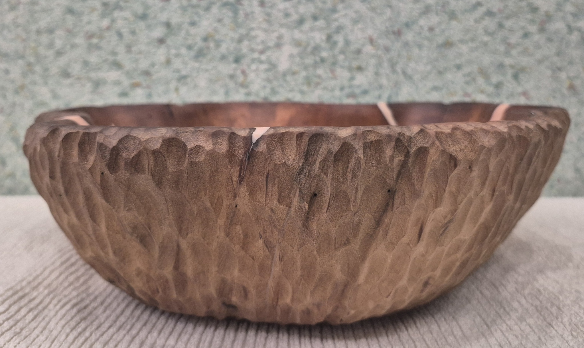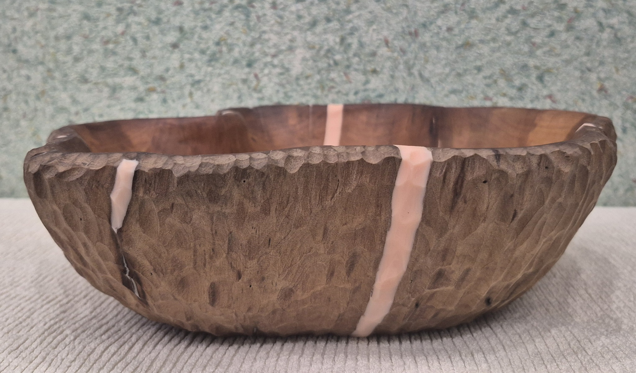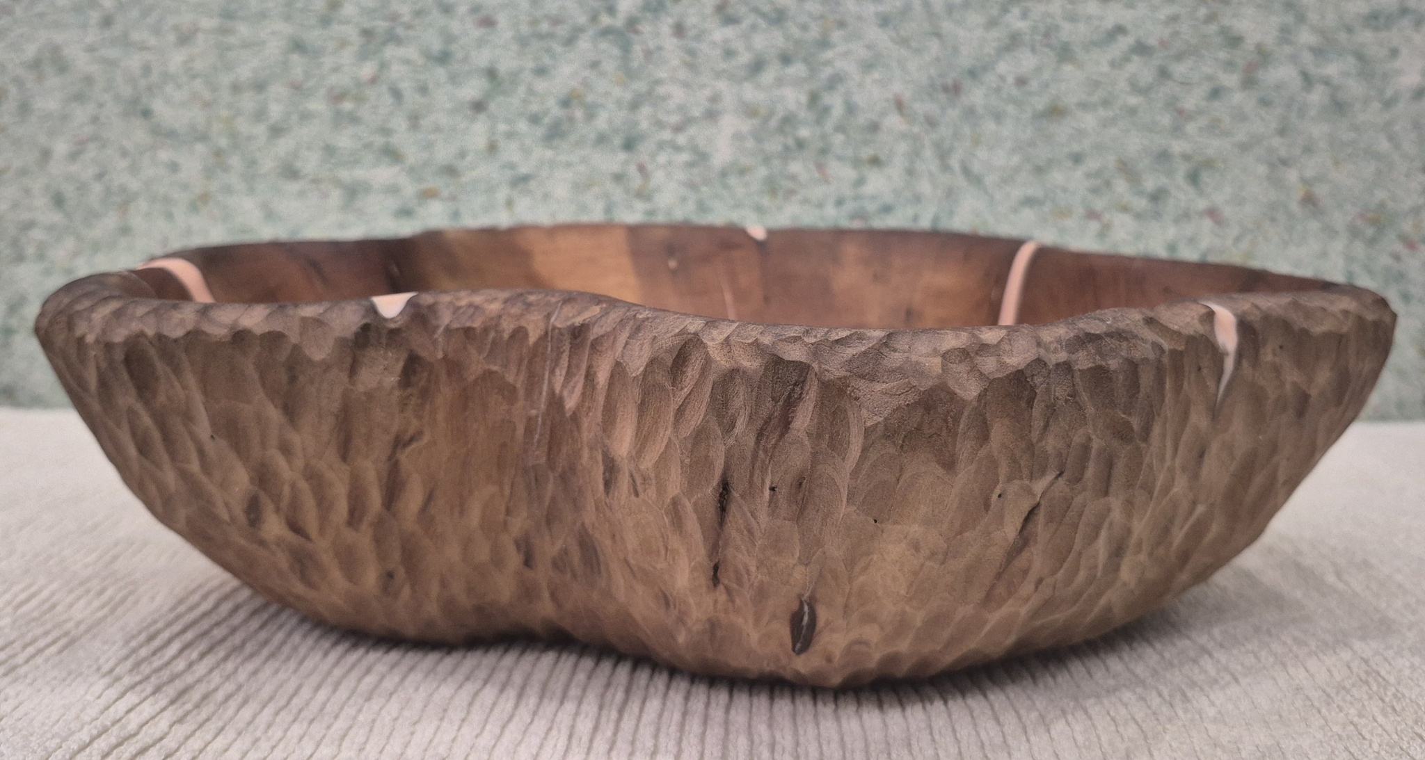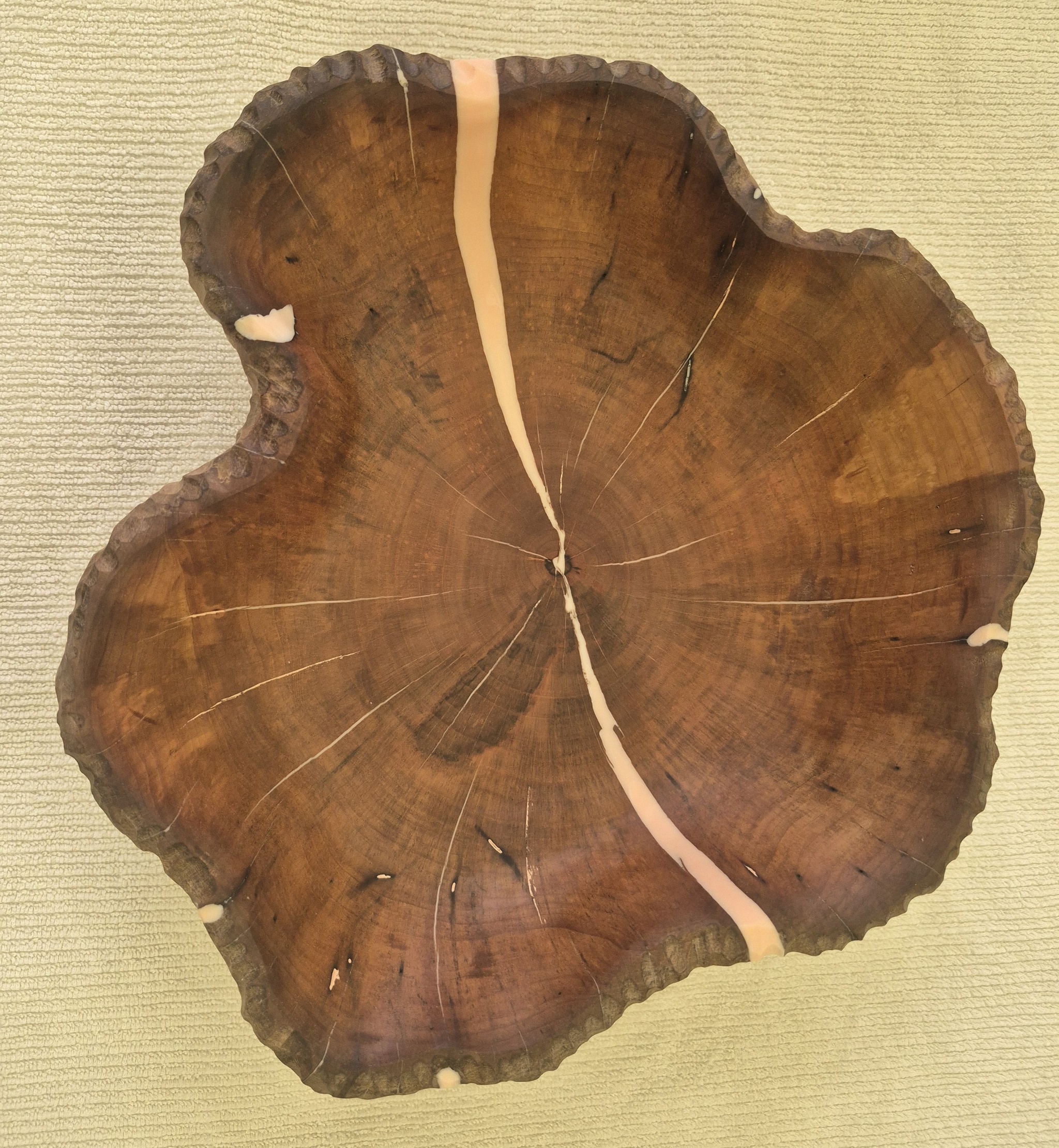 Трещины после термообработки залил эпоксидной смолой. Финишное покрытие - минеральное пищевое масло. Диаметр 25-31,5см, высота 8-8,5см.