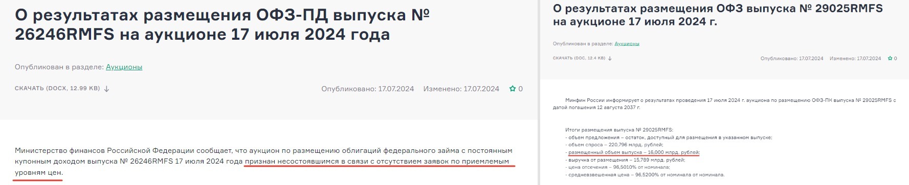 Среда у Минфина день аукционов ОФЗ. По плану были два аукциона: флоатер ОФЗ 29025 $SU29025RMFS2 и ОФЗ 26246 $SU26246RMFS7 с постоянным купоном.