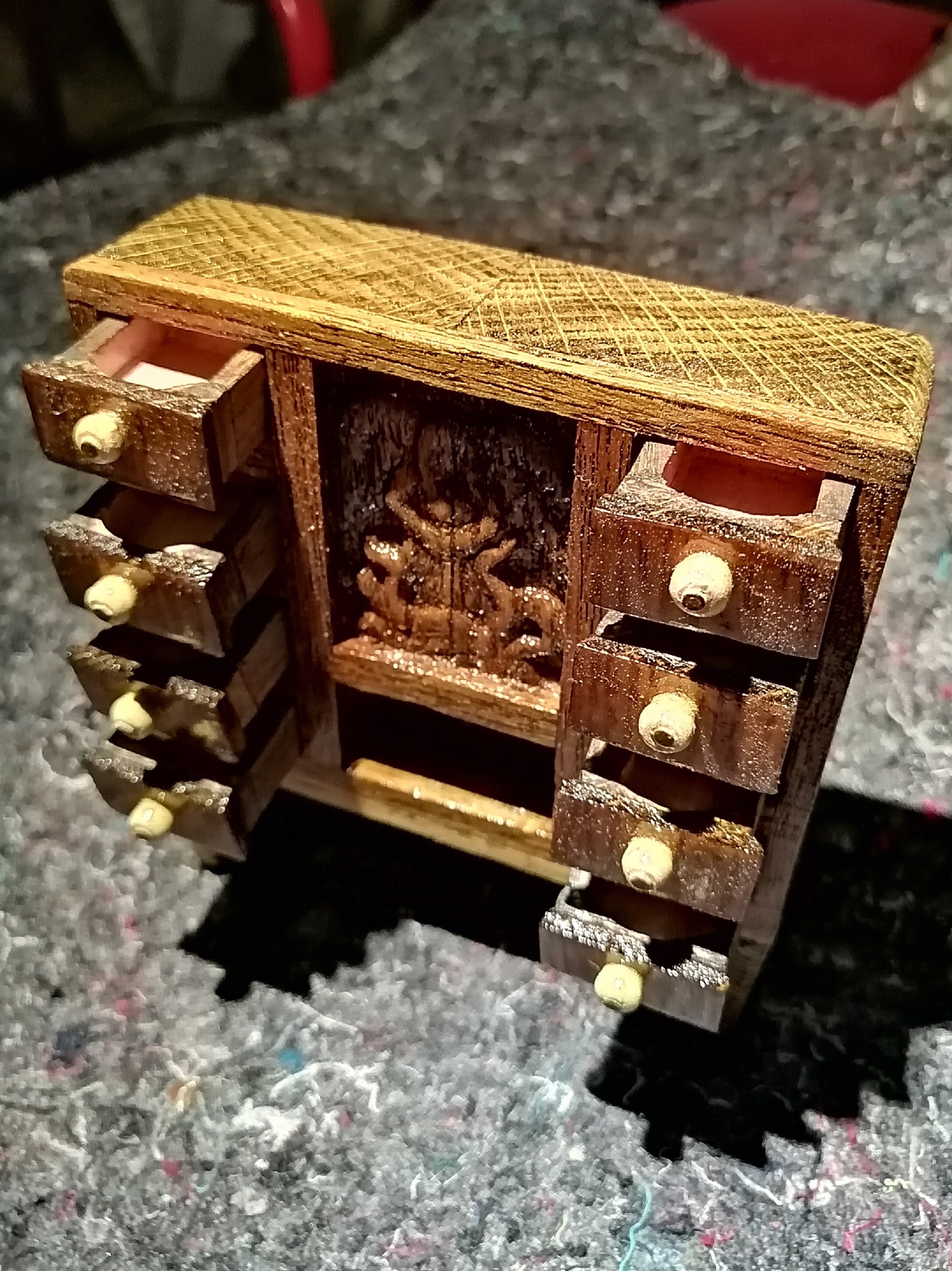 6 Kaliitka Мистер Комод 5 лет назад Создан из дуба, обвязан тиком, покрыт шеллаком. Размеры 10х11 см. Ящички выдвигаются, естественно. [моё] Хобби Миниатюра Комод Длиннопост Ещё 0