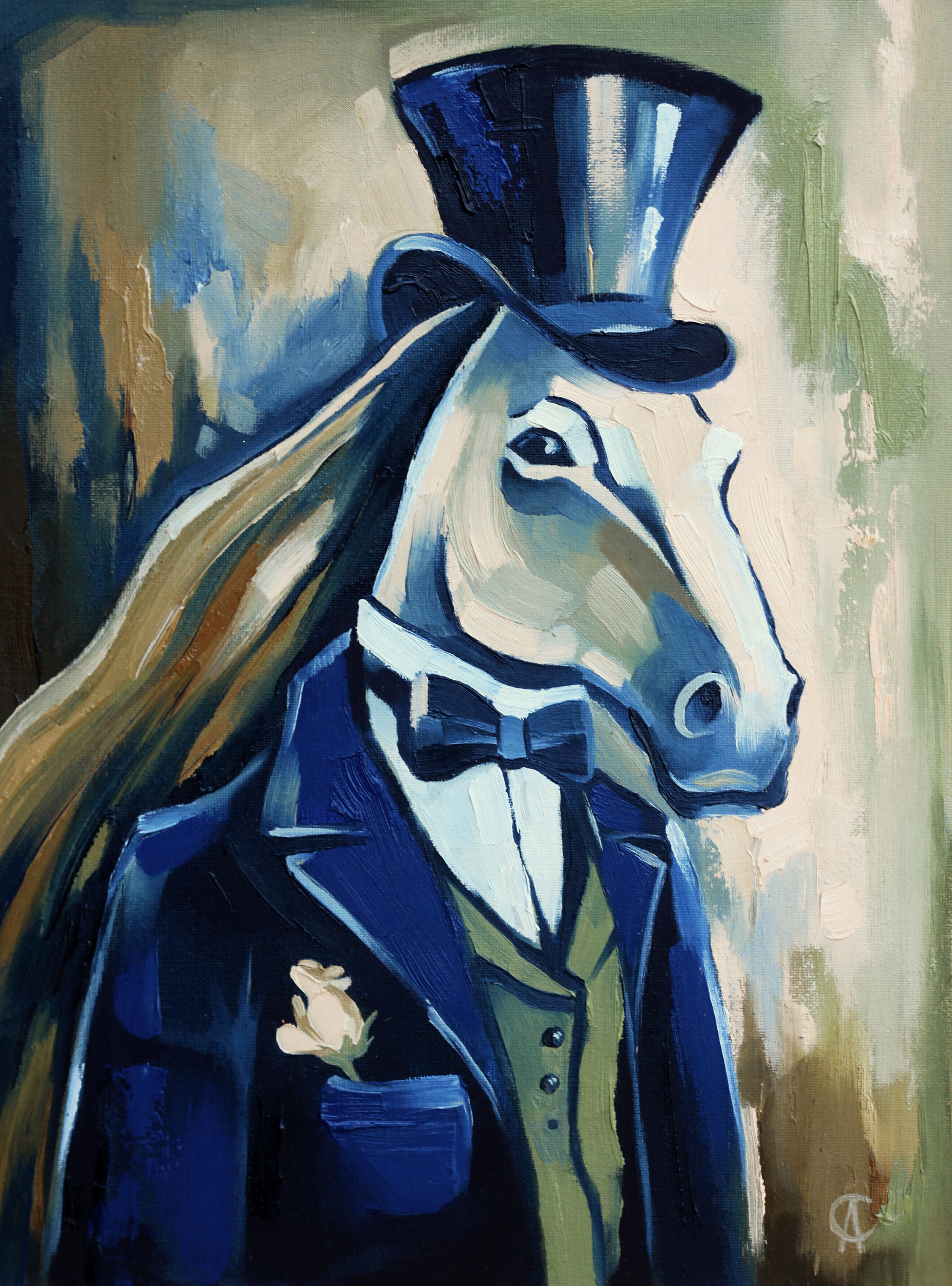 "Мистер Конь" — это портрет, который переносит нас в мир утончённой элегантности и ностальгии. Перед нами стоит конь, излучающий уверенность и шарм настоящего джентльмена. Его цилиндр и жилет словно рассказывают о вечерних баллах, где он был центром внимания. Чёрная бабочка на шее подчеркивает его стиль, а маленький бутон белой розы в кармане символизирует чистоту и нежность, скрытые за его мужественным обликом. Этот персонаж, возможно, был когда-то уважаемым участником светских встреч, оставившим свой след в сердцах многих. Его взгляд полон мудрости и таинственности, словно он хранит секреты прошедших эпох.