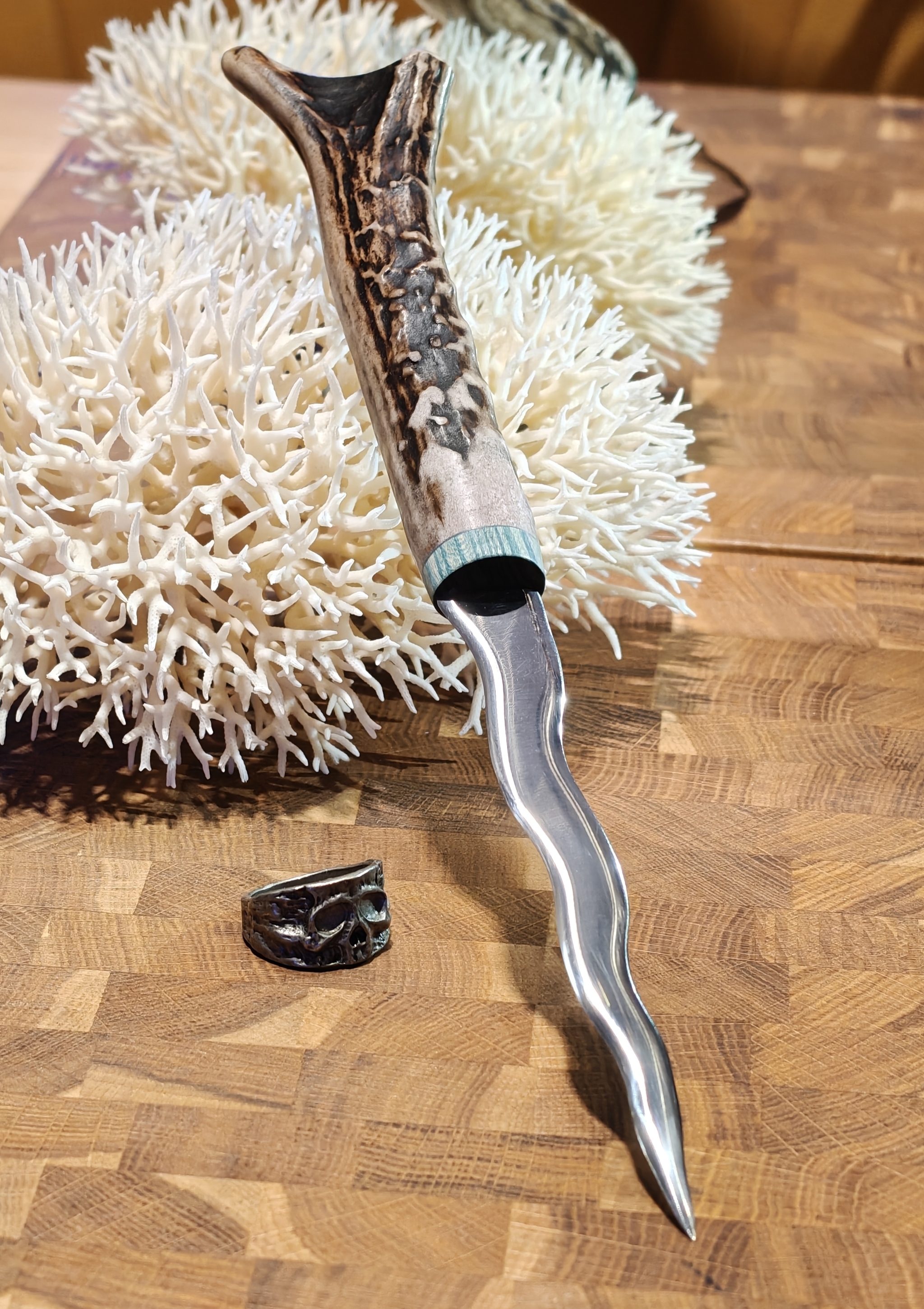 Всем привет, сегодня мистическое. Крис из японской стали SK5, закалка на 60HRC, рог косули и больстер из стабилизированной липы. Инструмент для отсекания негативных вибраций на ауру владельца и просто красивый артефакт.