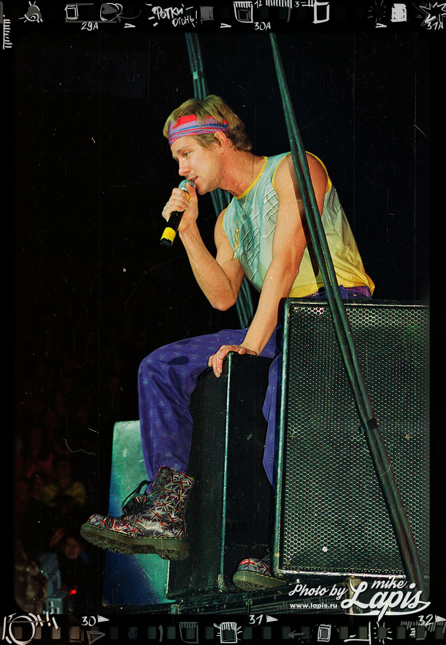 На днях в Питерском клубе А2 Диана Арбенина навернулась со 2-го этажа, потому что ходила там где нельзя ходить во время выступления. А я сразу вспомнил еще одного артиста, который пренебрегает правилами безопасности - это Митя Фомин из группы Hi-Fi. Он все время на выступлениях норовил залезть как можно выше и опасней. Это фото с Ледового дворца, где он облюбовал колонки сбоку от сцены и прыгал на них развлекая зрителей. А концерт был посвящен отчетному выступлению "Фабрики Звезд 1".
