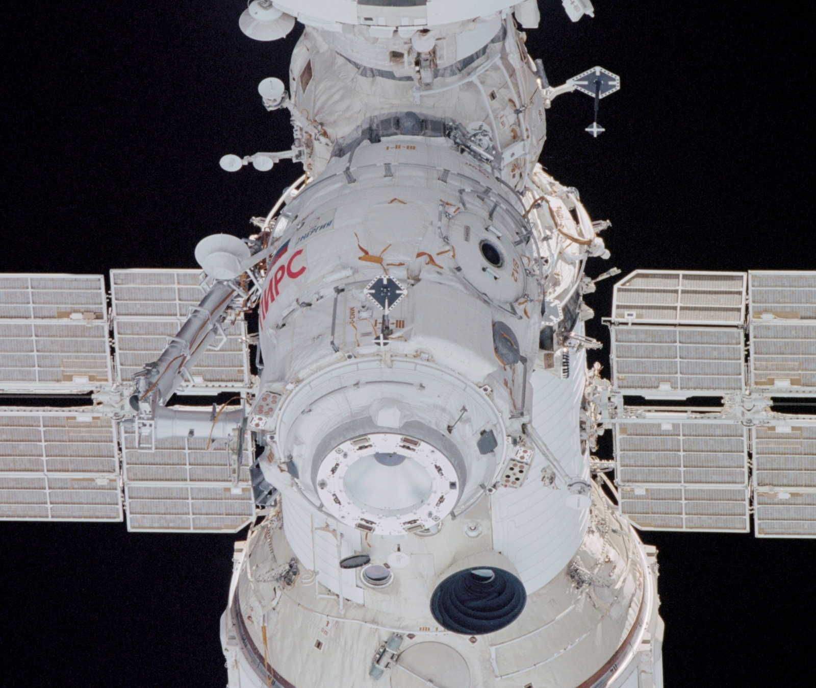 Пассивный стыковочный узел, расположенный с противоположной стороны отсека, предназначен для герметичного соединения с транспортными кораблями типа “Союз ТМ” и “Прогресс М”.