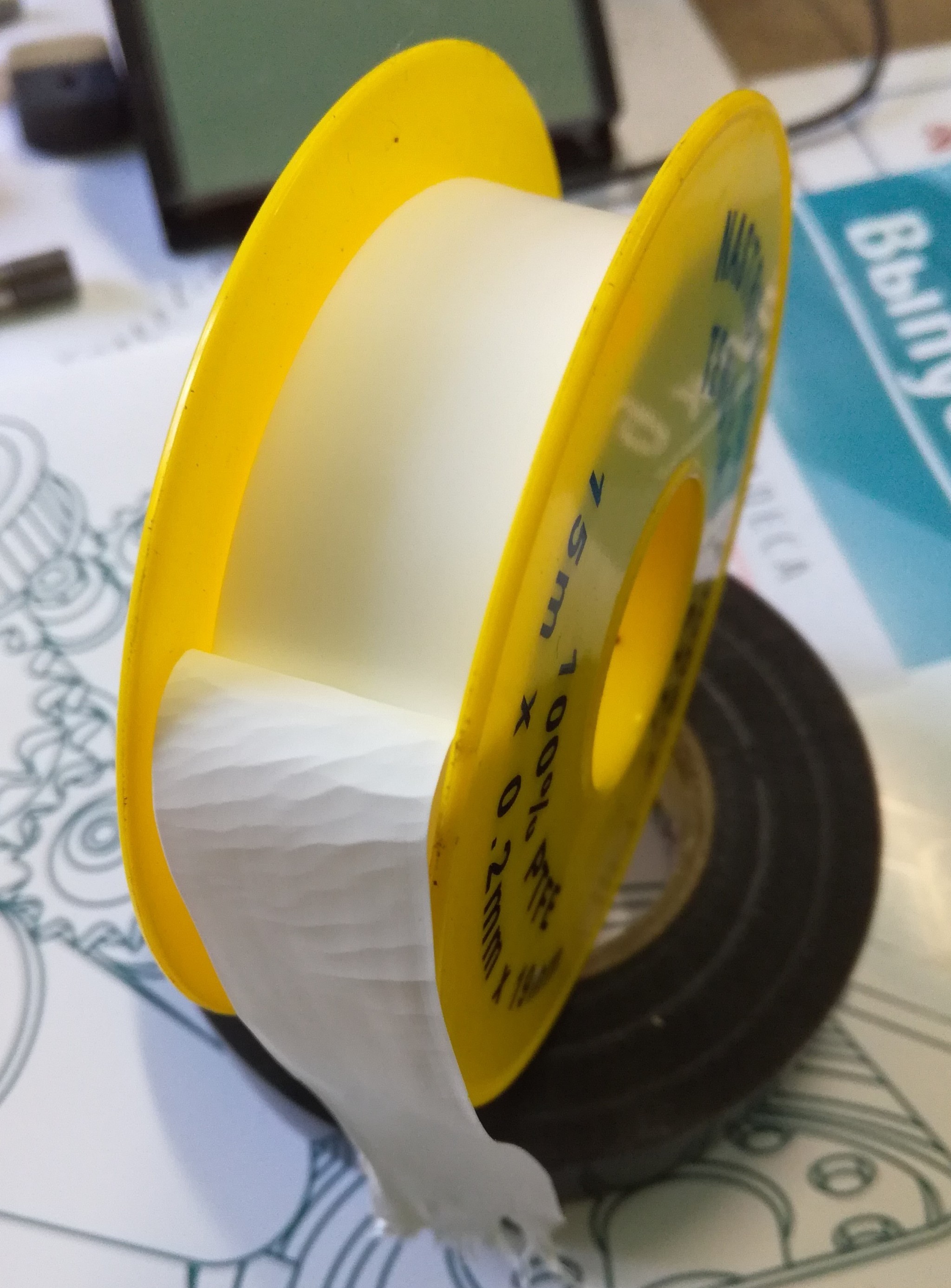 Стеклохолст с пропиткой из ПТФЭ (тефлоновая изолента). Довольно экзотическая изолента - обладает хорошей термостойкостью (некоторые коврики для выпечки делают из такого же материала), отменной химической стойкостью, и что самое важное - низкой адгезией к поверхности, тоесть она очень скользкая. Вы ее можете увидеть например в запайщиках пакетов, она проводит тепло, но пластик пакета к ней не прилипает.
