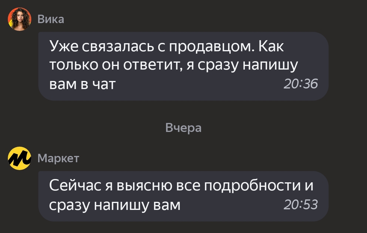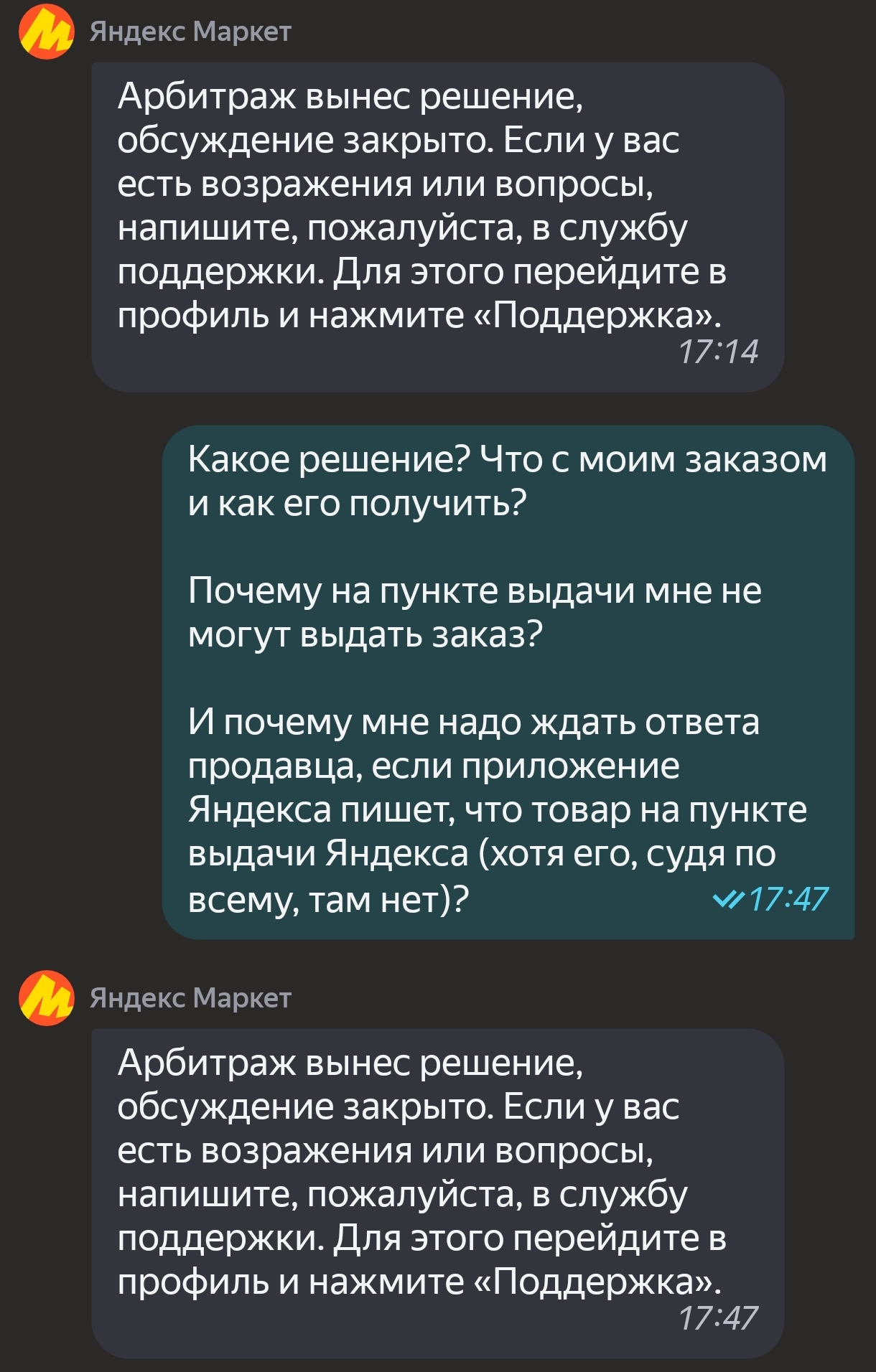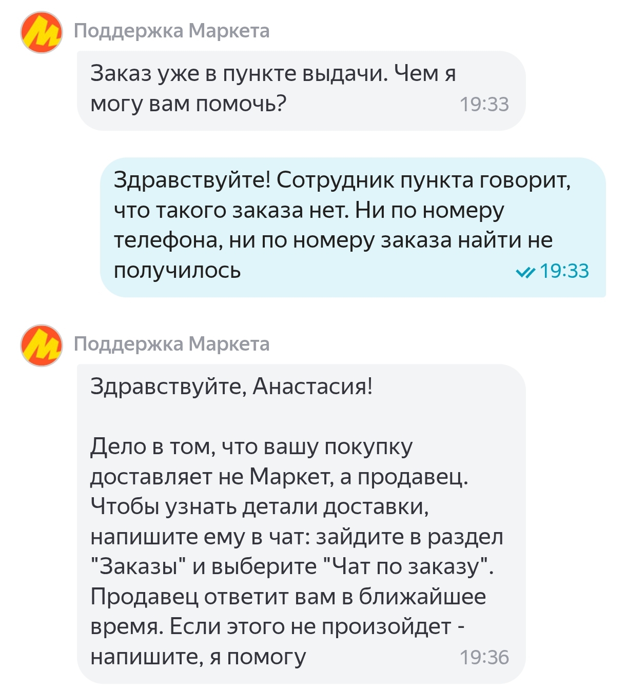 Я покинула пункт выдачи и связалась с поддержкой Яндекса. Однако оказалось, что проблемы с выдачей заказа в Яндекс.Маркете — это не проблемы Яндекс.Маркета, а исключительно головняк продавца и покупателя, поэтому и голову ебать надо продавцу (раз он такой дурак и через Яндекс.Маркет торгует).
