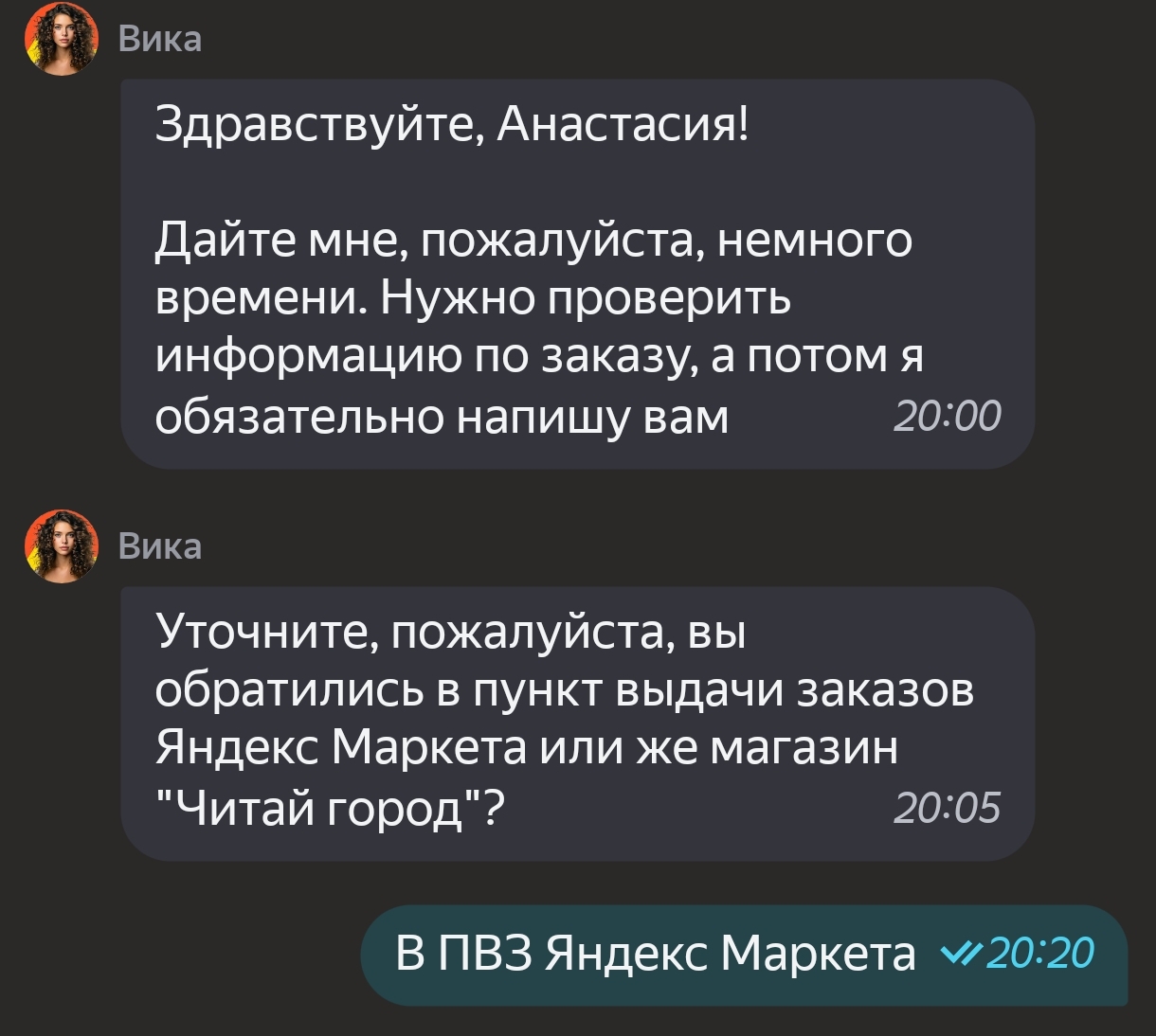 Со мной связалась девочка и спросила у меня, куда я пошла за заказом: в ПВЗ Яндекса или в Читай-город.