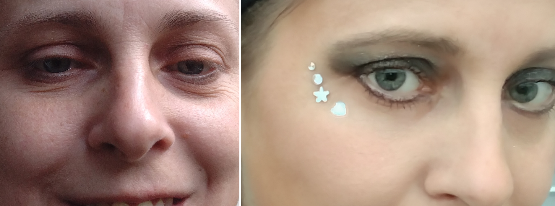 С покраской глаз пришлось повозиться не меньше, чем с покраской авто в прошлом году. Я ж как обычно привыкла, и уже много лет крашу так, как будто бы этот макияж к моему лицу приколочен. А тут надо было ж как в юности, и я теней зелёных навела(да, их ещё продают!).