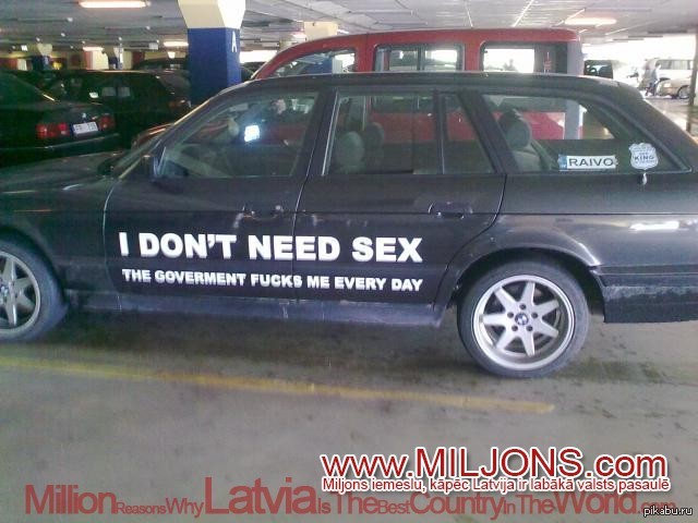14 miljonscom Мне не нужен секс 10 лет назад правительство е*ет меня каждый день. (Надпись на одной из латвийских машин) Miljonscom Fuck Латвия