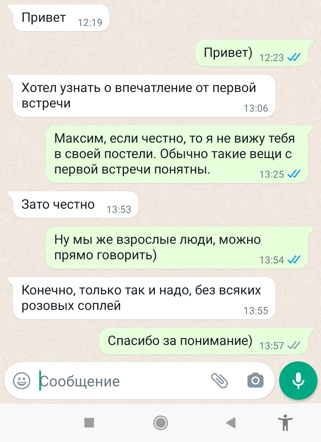 И после расставания она тебе сообщает: "Мне всё понравилось, можно повторить как-нибудь". Это - единственная обратная связь от девушки о проведённом времени. Более не происходит ничего.