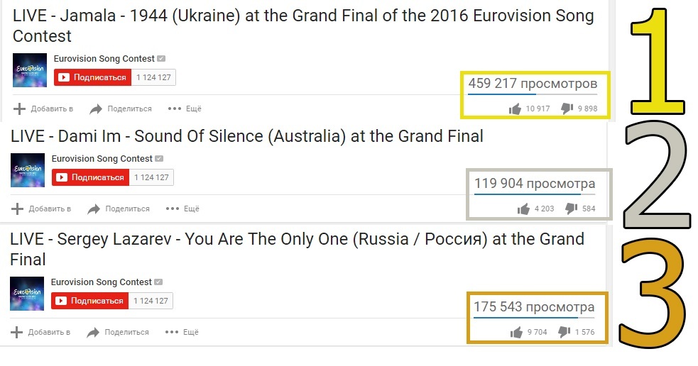 IceBalls Мнение народа (ещё один взгляд на результаты) 9 лет назад Я далек от политики и не смотрел этот конкурс, но с утра в новостях только это и пишут. И решил посмотреть результаты на официальном канале конкурса. Все, как говорится, на лицо. Особенно понравилось количество лайков и дизлайков :) [моё] Евровидение 2016 Украина Австралия Россия YouTube