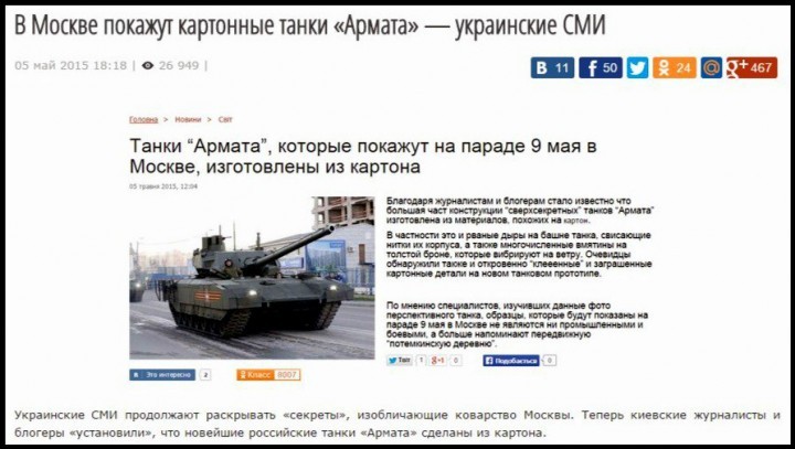 Когда по мостовой красной площади гремя прорезиненными траками шла «Армата», наши желто-синие соседи говорили о том, что она якобы изготовлена из картона. А отдельные детали и вовсе прикрутили проволокой.
